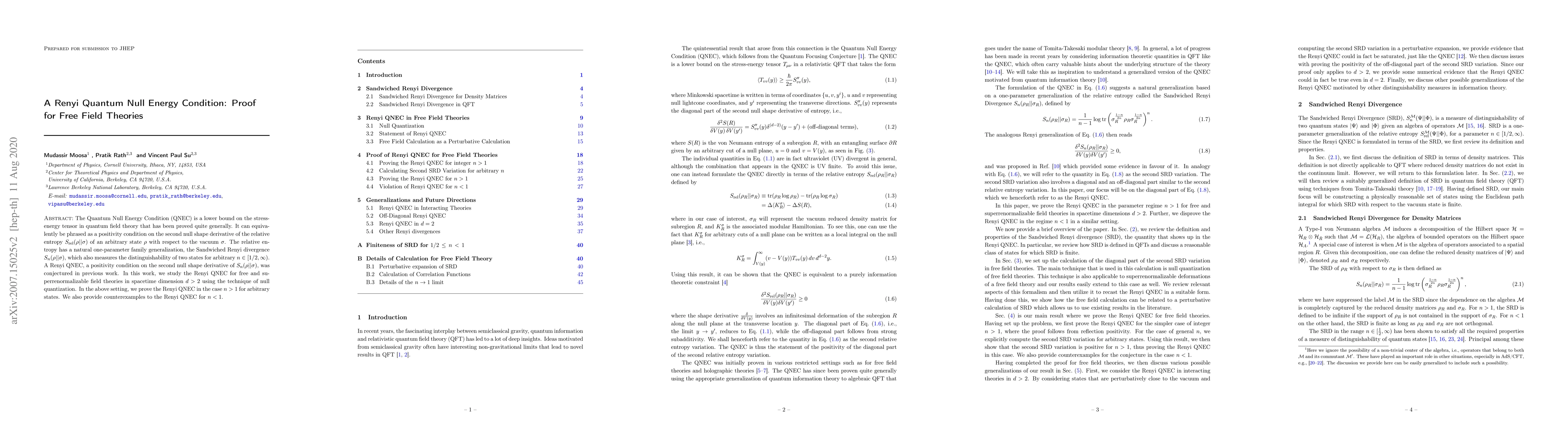The Quantum Null Energy Condition (QNEC) is a lower bound on the stress-energy tensor in quantum field theory that has been proved quite generally. It can equivalently be phrased as a positivity condition on the second null shape derivative of the relative entropy $S_{\text{rel}}(\rho||\sigma)$ of an arbitrary state $\rho$ with respect to the vacuum $\sigma$. The relative entropy has a natural one-parameter family generalization, the Sandwiched Renyi divergence $S_n(\rho||\sigma)$, which also measures the distinguishability of two states for arbitrary $n\in[1/2,\infty)$. A Renyi QNEC, a positivity condition on the second null shape derivative of $S_n(\rho||\sigma)$, was conjectured in previous work. In this work, we study the Renyi QNEC for free and superrenormalizable field theories in spacetime dimension $d>2$ using the technique of null quantization. In the above setting, we prove the Renyi QNEC in the case $n>1$ for arbitrary states. We also provide counterexamples to the Renyi QNEC for $n<1$.