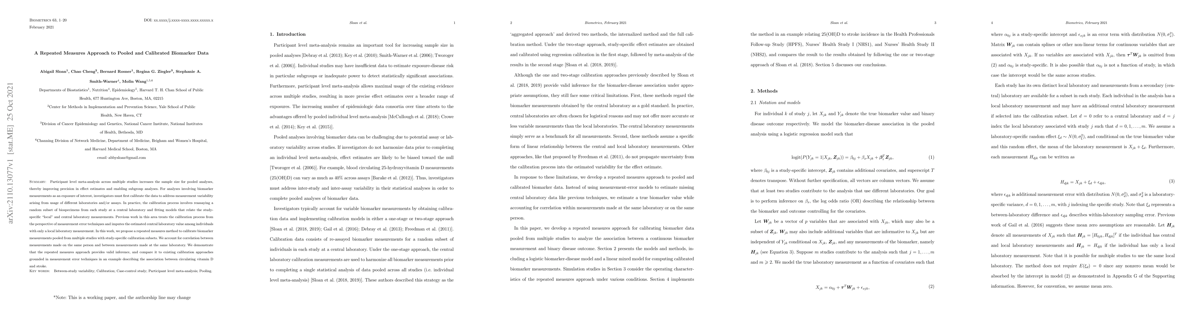 This paper proposes a repeated measures method to calibrate biomarker data pooled from multiple studies, accounting for correlations between measurements. It demonstrates the method's validity and compares it to existing calibration approaches, using an example of the association between vitamin D and stroke.