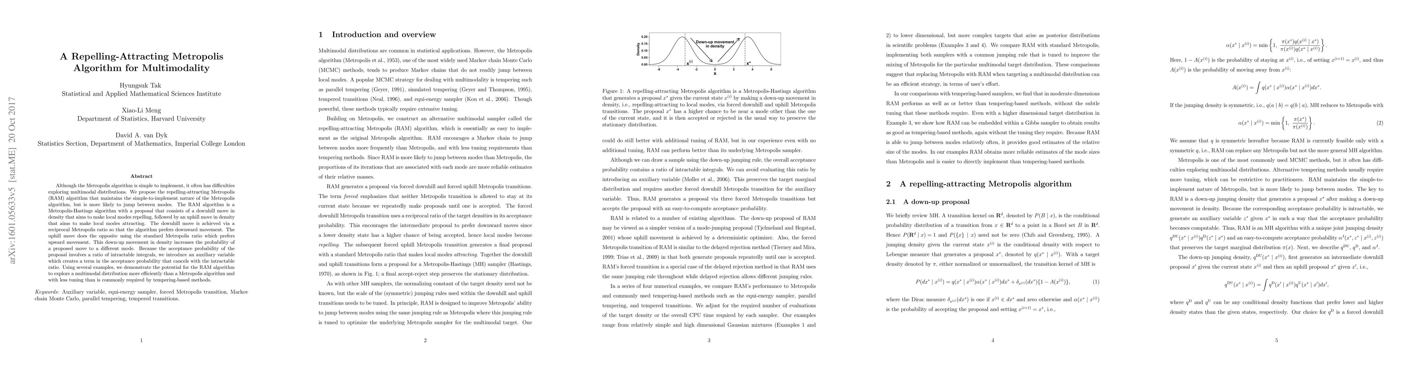 The repelling-attracting Metropolis (RAM) algorithm enhances the traditional Metropolis algorithm by incorporating a downhill-uphill density movement to better explore multimodal distributions, achieving efficient mode jumping with less tuning compared to tempering-based methods. The RAM algorithm uses a reciprocal Metropolis ratio for the downhill move and a standard ratio for the uphill move, aided by an auxiliary variable to simplify acceptance probability calculations.
