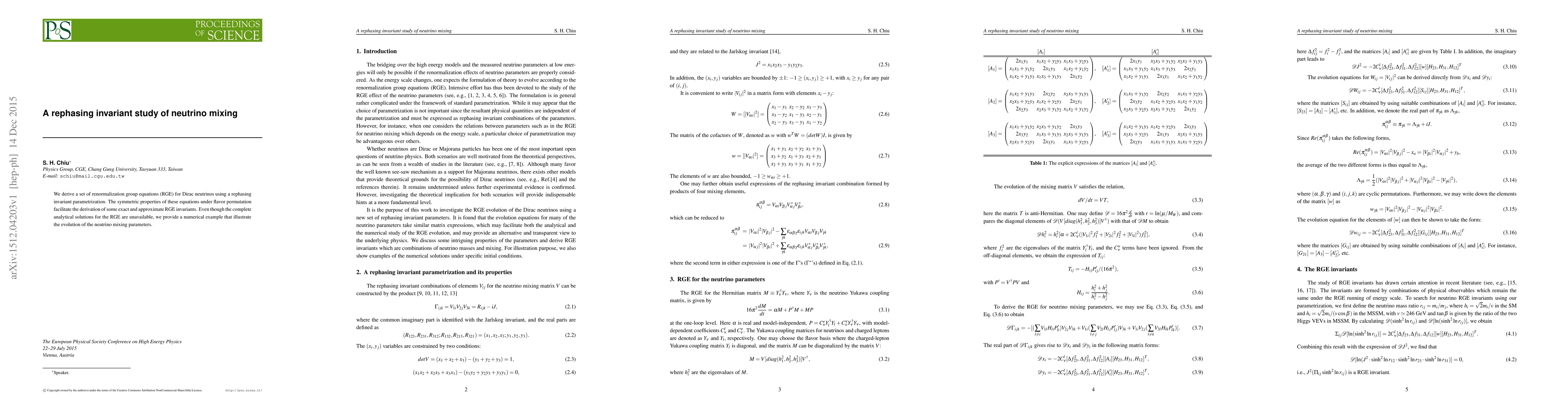 This paper derives renormalization group equations for Dirac neutrinos using a rephasing invariant parametrization, facilitating the derivation of exact and approximate invariants. Although analytical solutions are unavailable, a numerical example demonstrates the evolution of neutrino mixing parameters.