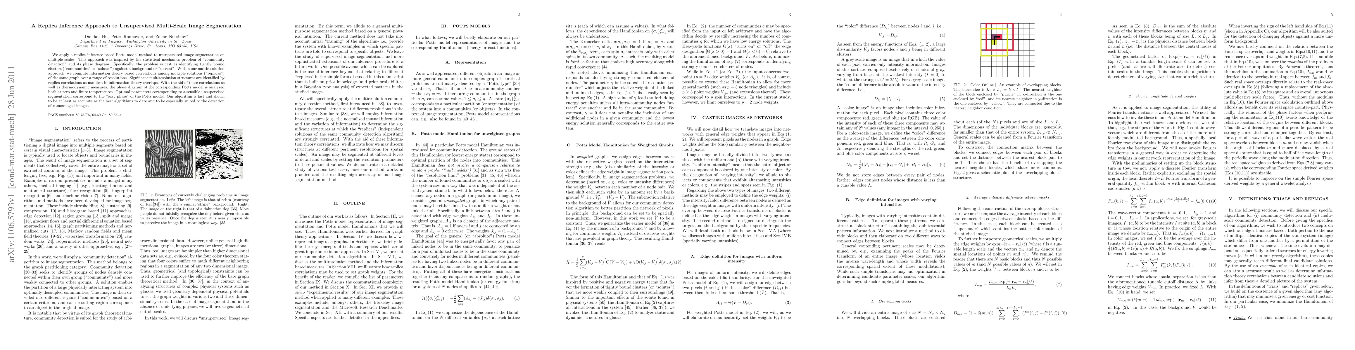 We apply a replica inference based Potts model method to unsupervised image segmentation on multiple scales. This approach was inspired by the statistical mechanics problem of "community detection" and its phase diagram. Specifically, the problem is cast as identifying tightly bound clusters ("communities" or "solutes") against a background or "solvent". Within our multiresolution approach, we compute information theory based correlations among multiple solutions ("replicas") of the same graph over a range of resolutions. Significant multiresolution structures are identified by replica correlations as manifest in information theory overlaps. With the aid of these correlations as well as thermodynamic measures, the phase diagram of the corresponding Potts model is analyzed both at zero and finite temperatures. Optimal parameters corresponding to a sensible unsupervised segmentation correspond to the "easy phase" of the Potts model. Our algorithm is fast and shown to be at least as accurate as the best algorithms to date and to be especially suited to the detection of camouflaged images.