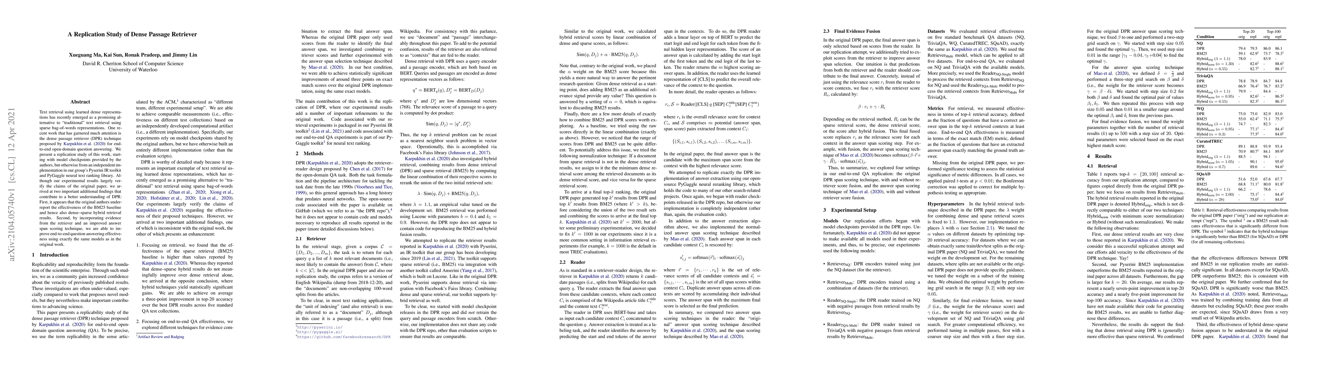 This replication study of the dense passage retriever (DPR) technique reveals that the original authors may have under-reported the performance of BM25 baselines and hybrid retrieval methods. The researchers improved question answering performance using the same models by incorporating evidence from the retriever and an enhanced answer span scoring technique.