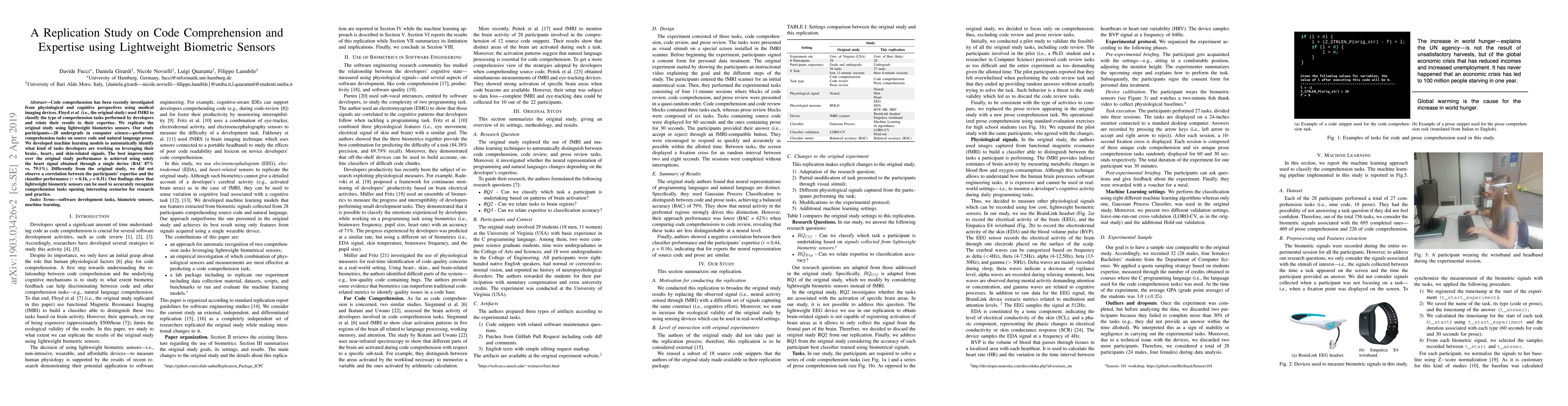 This study replicates Floyd et al.'s fMRI-based investigation on code comprehension using lightweight biometric sensors, achieving better task classification accuracy (87% vs. 79.1%) with heart signals alone. However, unlike the original study, no correlation was found between expertise and task classification performance.