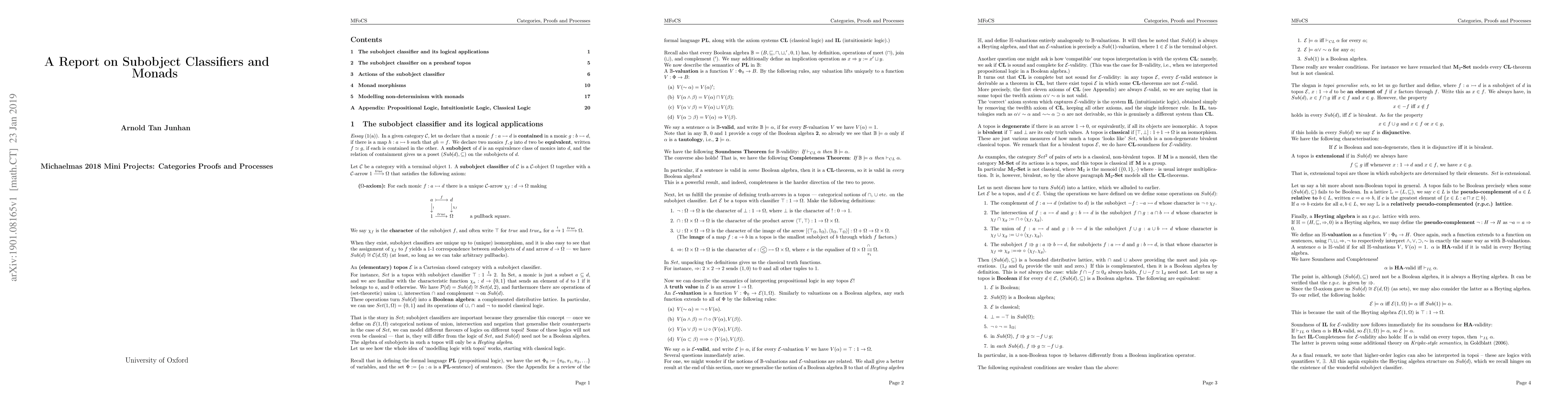 A two-part report, containing (unrelated) essays on subobject classifiers and on monads.