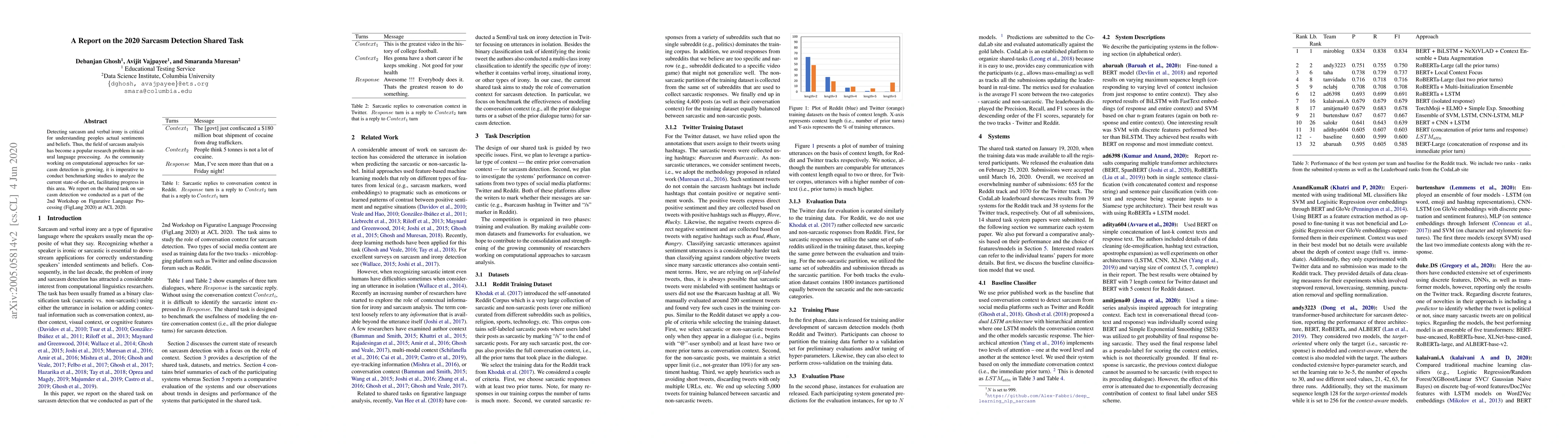 Detecting sarcasm and verbal irony is critical for understanding people's actual sentiments and beliefs. Thus, the field of sarcasm analysis has become a popular research problem in natural language processing. As the community working on computational approaches for sarcasm detection is growing, it is imperative to conduct benchmarking studies to analyze the current state-of-the-art, facilitating progress in this area. We report on the shared task on sarcasm detection we conducted as a part of the 2nd Workshop on Figurative Language Processing (FigLang 2020) at ACL 2020.