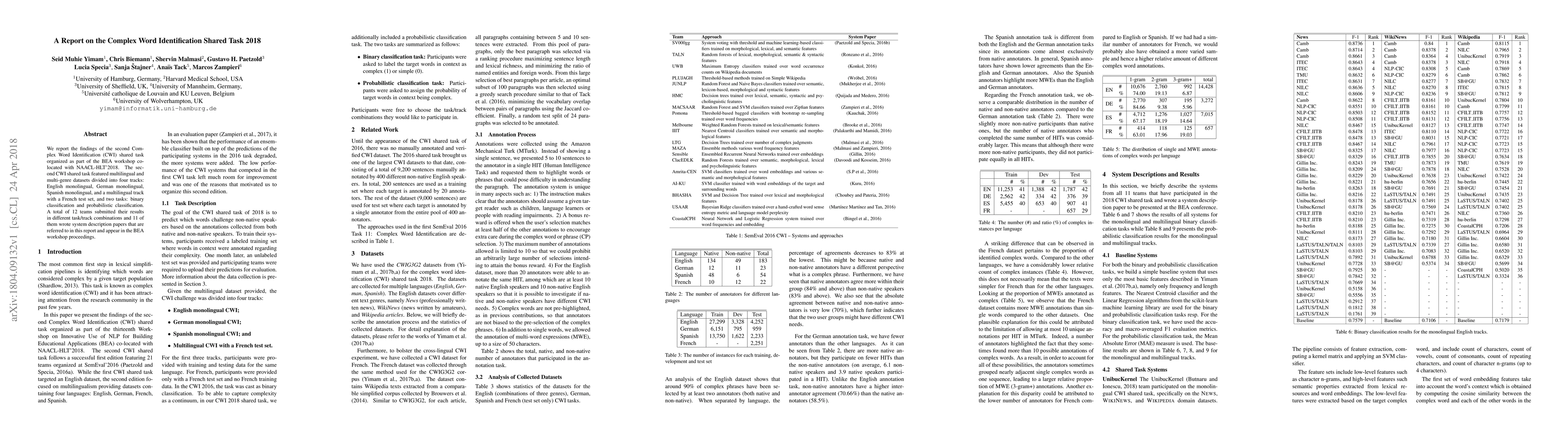 This report details the outcomes of the 2018 Complex Word Identification shared task, featuring multilingual and multi-genre datasets across four tracks: English, German, Spanish, and a multilingual French test set. The task included binary and probabilistic classification, with 12 teams participating and 11 submitting system descriptions.