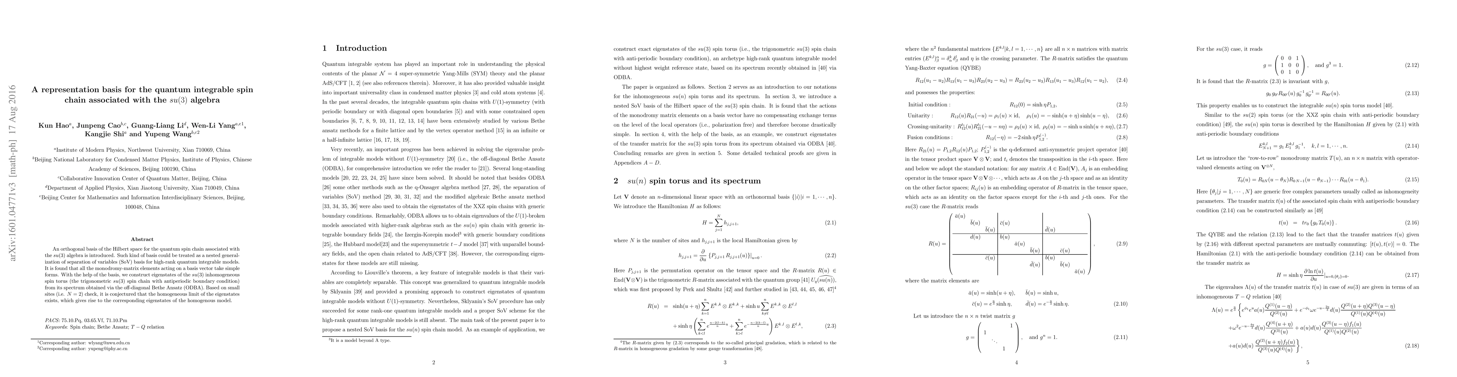 This paper introduces an orthogonal basis for the quantum integrable spin chain associated with the su(3) algebra, generalizing the separation of variables (SoV) basis for high-rank models. The basis simplifies the monodromy-matrix elements, enabling the construction of eigenstates for the su(3) inhomogeneous spin torus, with a conjecture for the existence of corresponding eigenstates in the homogeneous limit.