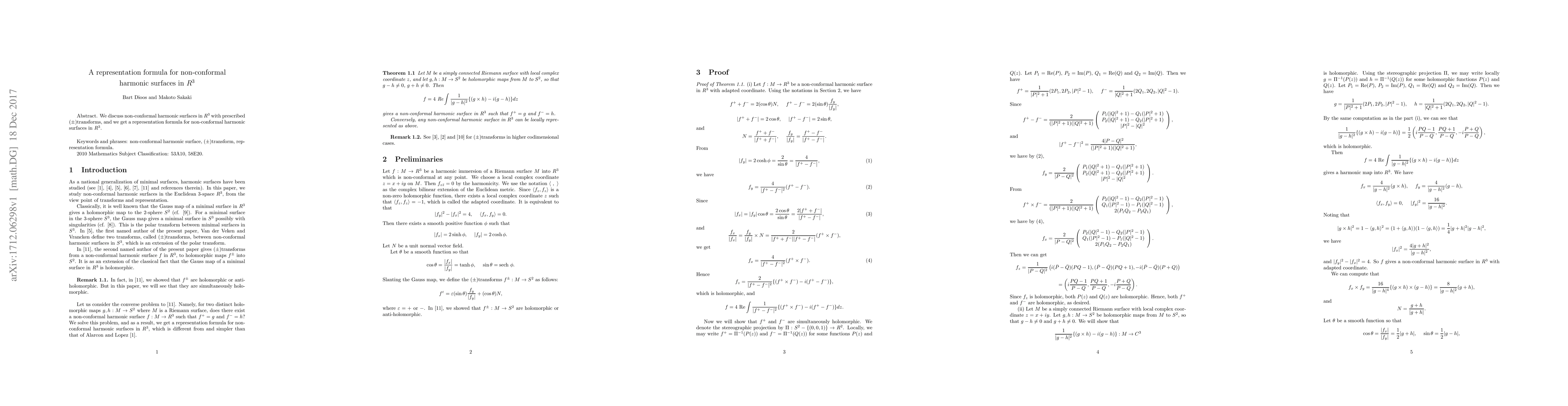 Summary: This paper presents a representation formula for non-conformal harmonic surfaces in $R^3$ with prescribed ($\pm$) transforms, contributing to the understanding of such surfaces in three-dimensional Euclidean space. The derived formula provides a new perspective on the geometric properties of these surfaces.