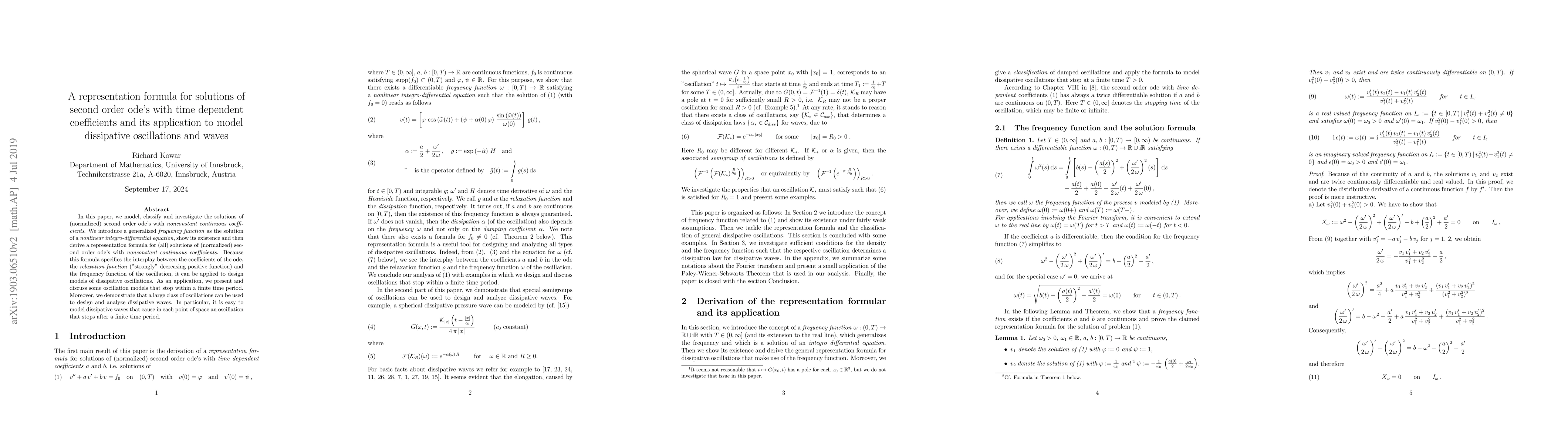 In this paper, we model, classify and investigate the solutions of (normalized) second order ode's with \emph{nonconstant continuous coefficients}. We introduce a generalized \emph{frequency function} as the solution of a \emph{nonlinear integro-differential equation}, show its existence and then derive a representation formula for (all) solutions of (normalized) second order ode's with \emph{nonconstant continuous coefficients}. Because this formula specifies the interplay between the coefficients of the ode, the \emph{relaxation function} ("strongly" decreasing positive function) and the frequency function of the oscillation, it can be applied to design models of dissipative oscillations. As an application, we present and discuss some oscillation models that stop within a finite time period. Moreover, we demonstrate that a large class of oscillations can be used to design and analyze dissipative waves. In particular, it is easy to model dissipative waves that cause in each point of space an oscillation that stops after a finite time period.