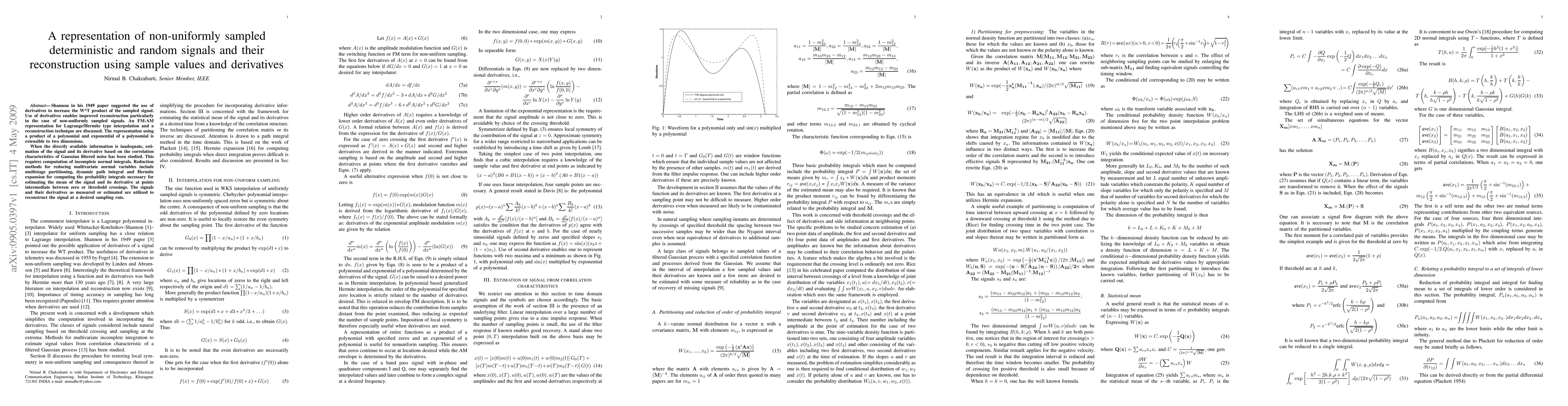 The paper proposes a novel method for representing and reconstructing non-uniformly sampled deterministic and random signals using sample values and derivatives. It introduces an FM-AM representation for Lagrange/Hermite interpolation and a reconstruction technique, extensible to 2D. The method also includes estimating signals and derivatives from Gaussian noise correlation, involving incomplete normal integrals. Reduction methods for multivariate normal variables are discussed for estimating signal and derivative means. The approach enhances signal reconstruction at desired sampling rates.