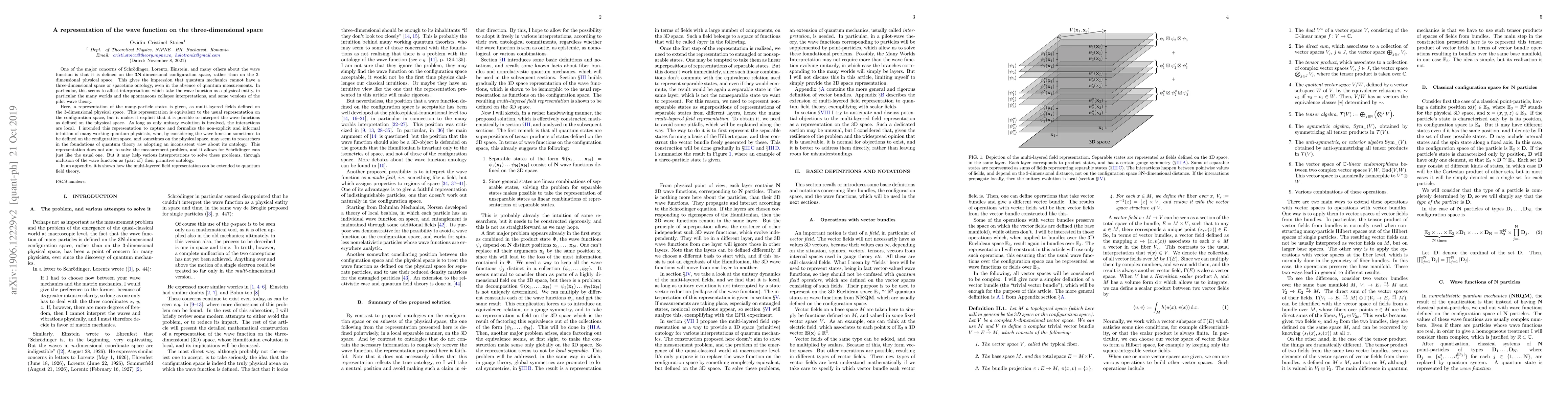 One of the major concerns of Schr\"odinger, Lorentz, Einstein, and many others about the wave function is that it is defined on the $3\mathbf{N}$-dimensional configuration space, rather than on the $3$-dimensional physical space. This gives the impression that quantum mechanics cannot have a three-dimensional space or spacetime ontology, even in the absence of quantum measurements. In particular, this seems to affect interpretations which take the wave function as a physical entity, in particular the many worlds and the spontaneous collapse interpretations, and some versions of the pilot wave theory. Here, a representation of the many-particle states is given, as multi-layered fields defined on the $3$-dimensional physical space. This representation is equivalent to the usual representation on the configuration space, but it makes it explicit that it is possible to interpret the wave functions as defined on the physical space. As long as only unitary evolution is involved, the interactions are local. I intended this representation to capture and formalize the non-explicit and informal intuition of many working quantum physicists, who, by considering the wave function sometimes to be defined on the configuration space, and sometimes on the physical space, may seem to researchers in the foundations of quantum theory as adopting an inconsistent view about its ontology. This representation does not aim to solve the measurement problem, and it allows for Schr\"odinger cats just like the usual one. But it may help various interpretations to solve these problems, through inclusion of the wave function as (part of) their primitive ontology. In an appendix, it is shown how the multi-layered field representation can be extended to quantum field theory.