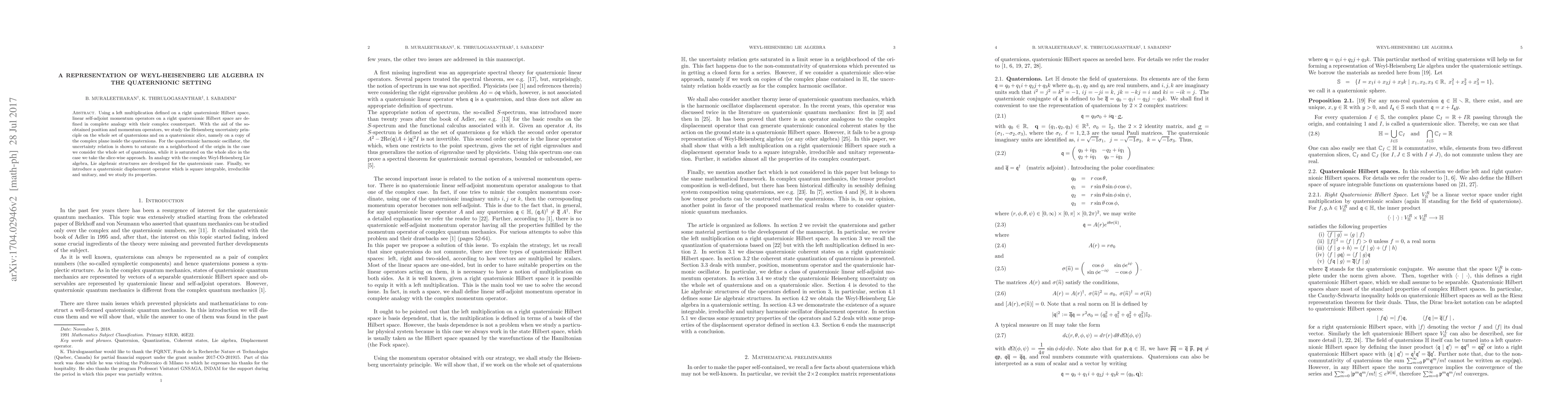 This paper develops a quaternionic representation of the Weyl-Heisenberg Lie algebra, defining linear self-adjoint momentum operators in a right quaternionic Hilbert space. It explores the Heisenberg uncertainty principle and the quaternionic harmonic oscillator, showing different saturation behaviors in the full quaternionic set versus a complex plane slice.