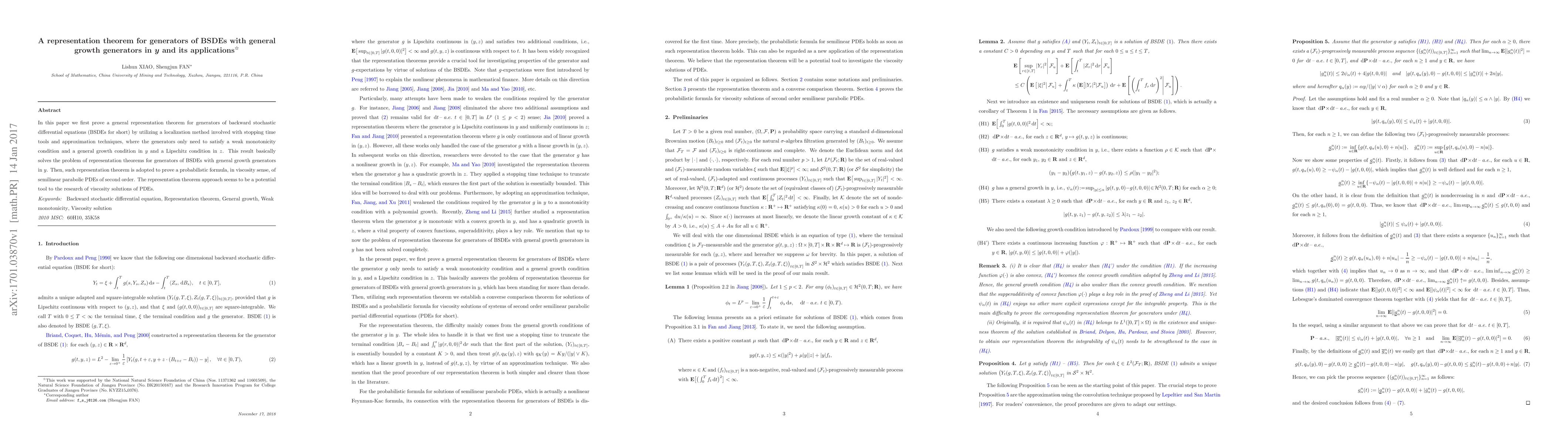 This paper proves a representation theorem for generators of BSDEs under general growth conditions in $y$ and weak monotonicity, using localization and approximation techniques. It then applies this theorem to derive a probabilistic formula for semilinear parabolic PDEs, suggesting its utility in studying viscosity solutions of PDEs.