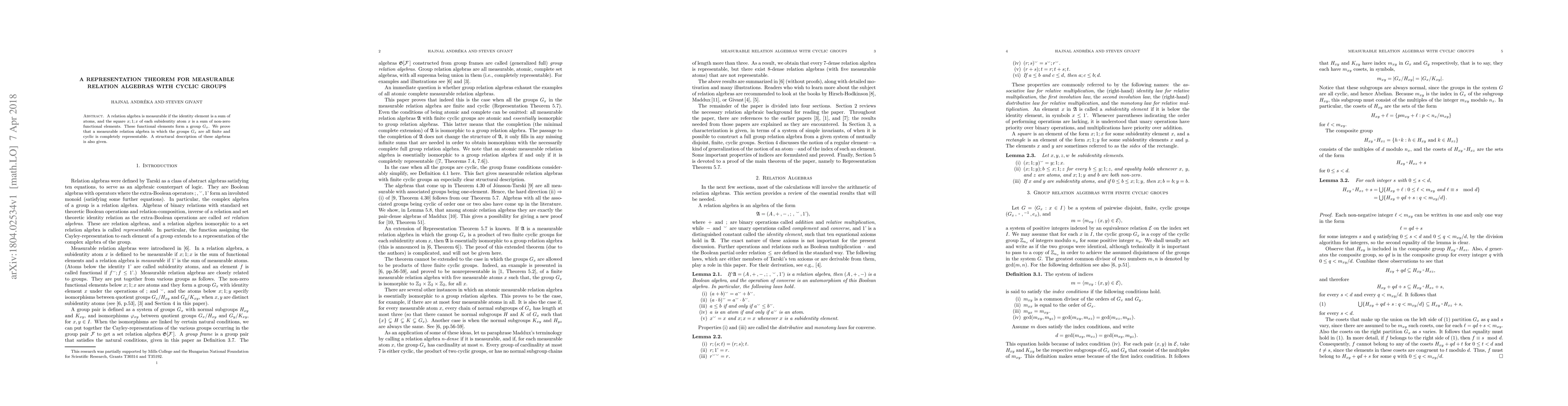A relation algebra is measurable if the identity element is a sum of atoms, and the square x;1;x of each subidentity atom x is a sum of non-zero functional elements. These functional elements form a group Gx. We prove that a measurable relation algebra in which the groups Gx are all finite and cyclic is completely representable. A structural description of these algebras is also given.