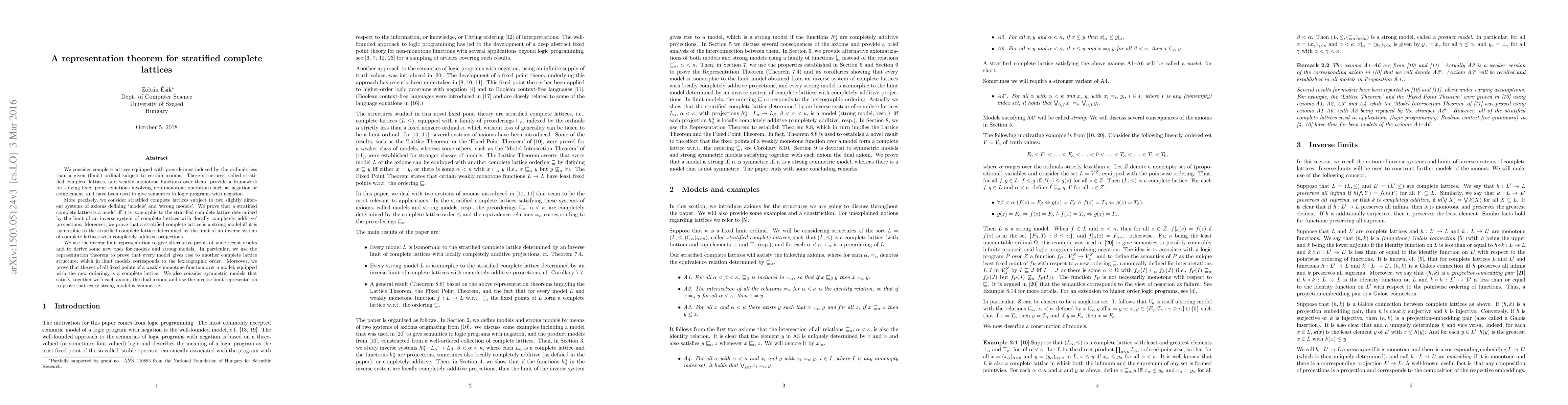 We consider complete lattices equipped with preorderings indexed by the ordinals less than a given (limit) ordinal subject to certain axioms. These structures, called stratified complete lattices, and weakly monotone functions over them, provide a framework for solving fixed point equations involving non-monotone operations such as negation or complement, and have been used to give semantics to logic programs with negation. More precisely, we consider stratified complete lattices subject to two slightly different systems of axioms defining `models' and `strong models'. We prove that a stratified complete lattice is a model iff it is isomorphic to the stratified complete lattice determined by the limit of an inverse system of complete lattices with `locally completely additive' projections. Moreover, we prove that a stratified complete lattice is a strong model iff it is isomorphic to the stratified complete lattice determined by the limit of an inverse system of complete lattices with completely additive projections. We use the inverse limit representation to give alternative proofs of some recent results and to derive some new ones for models and strong models. In particular, we use the representation theorem to prove that every model gives rise to another complete lattice structure, which in limit models corresponds to the lexicographic order. Moreover, we prove that the set of all fixed points of a weakly monotone function over a model, equipped with the new ordering, is a complete lattice. We also consider symmetric models that satisfy, together with each axiom, the dual axiom, and use the inverse limit representation to prove that every strong model is symmetric.