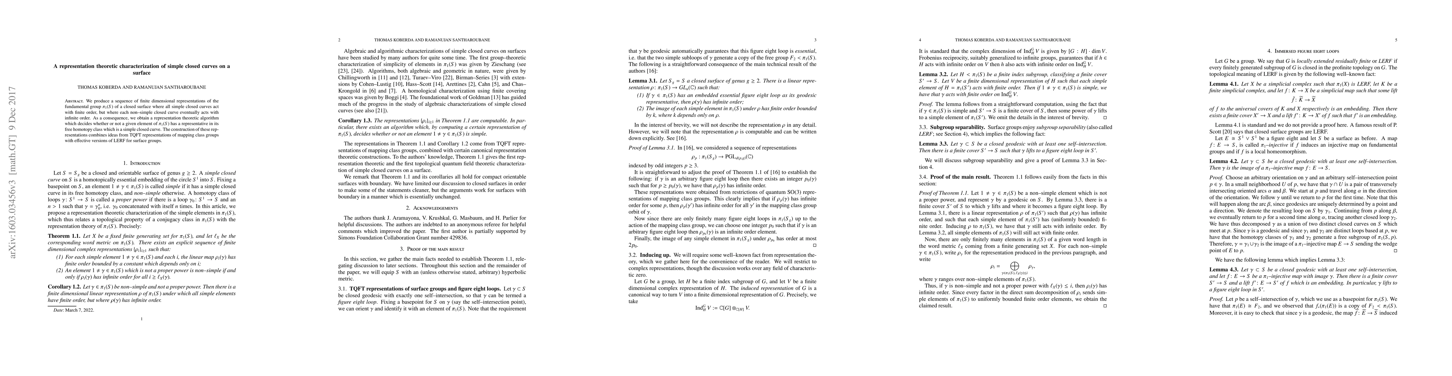 We produce a sequence of finite dimensional representations of the fundamental group $\pi_1(S)$ of a closed surface where all simple closed curves act with finite order, but where each non--simple closed curve eventually acts with infinite order. As a consequence, we obtain a representation theoretic algorithm which decides whether or not a given element of $\pi_1(S)$ is freely homotopic to a simple closed curve. The construction of these representations combines ideas from TQFT representations of mapping class groups with effective versions of LERF for surface groups.