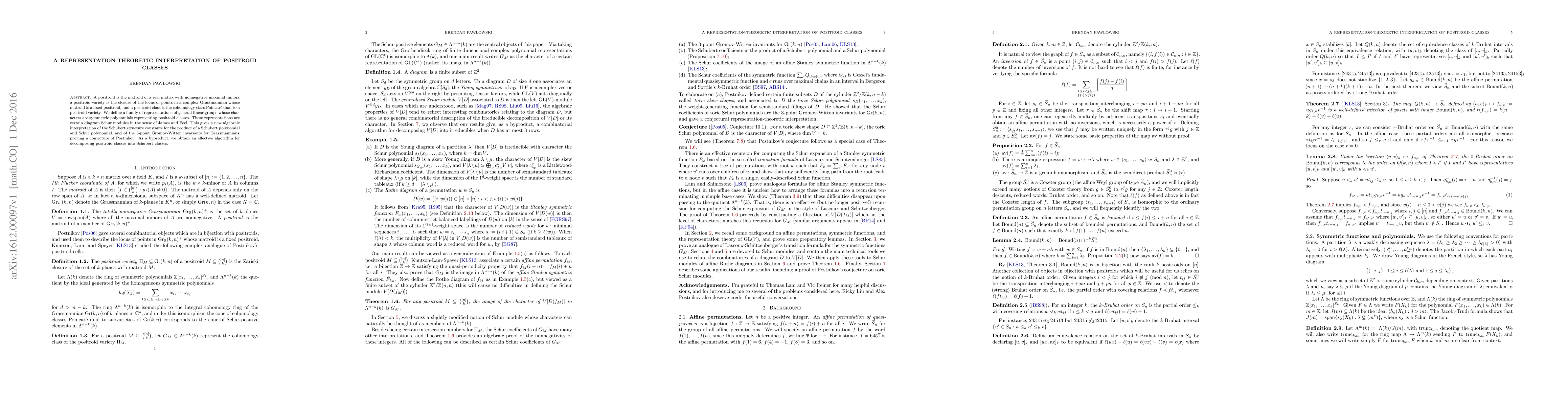 This paper defines representations of general linear groups whose characters correspond to positroid classes, providing a new algebraic interpretation of Schubert structure constants and Gromov-Witten invariants, and yielding an effective algorithm for decomposing positroid classes into Schubert classes.