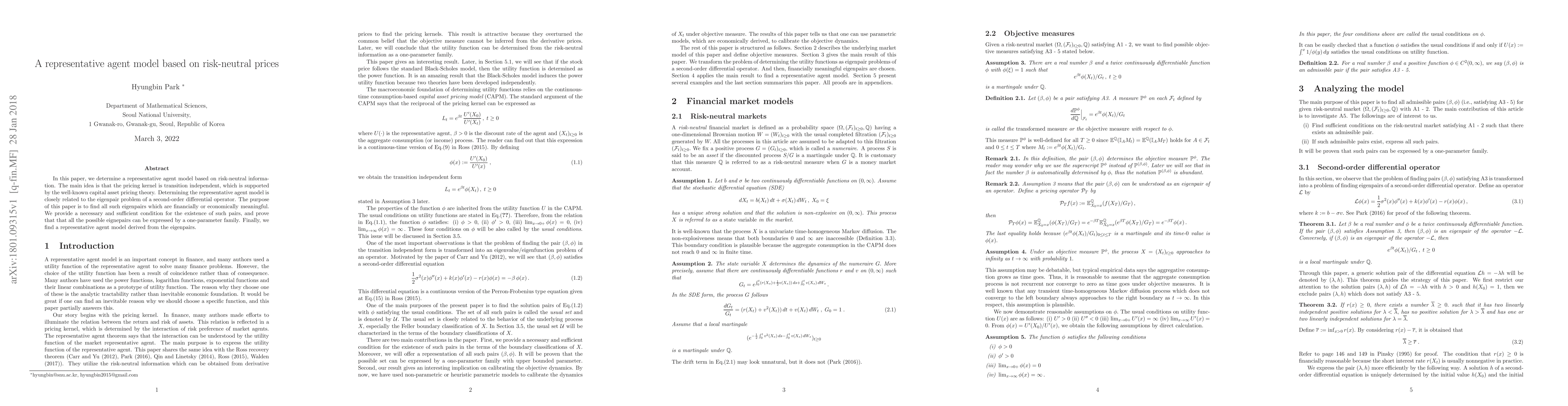 In this paper, we determine a representative agent model based on risk-neutral information. The main idea is that the pricing kernel is transition independent, which is supported by the well-known capital asset pricing theory. Determining the representative agent model is closely related to the eigenpair problem of a second-order differential operator. The purpose of this paper is to find all such eigenpairs which are financially or economically meaningful. We provide a necessary and sufficient condition for the existence of such pairs, and prove that that all the possible eignepairs can be expressed as a one-parameter family. Finally, we find a representative agent model derived from the eigenpairs.