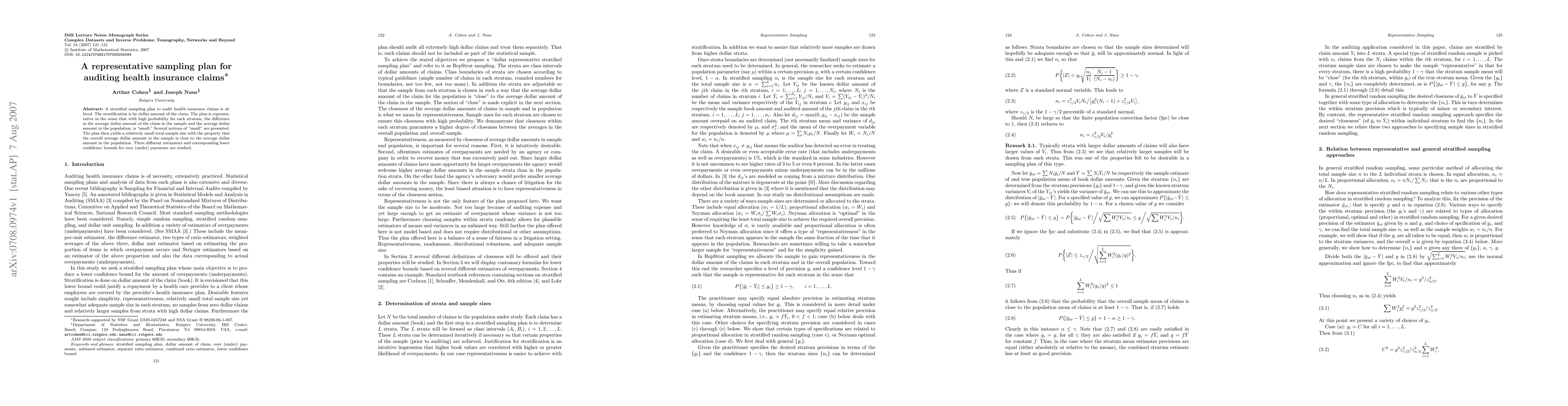 A stratified sampling plan to audit health insurance claims is offered. The stratification is by dollar amount of the claim. The plan is representative in the sense that with high probability for each stratum, the difference in the average dollar amount of the claim in the sample and the average dollar amount in the population, is ``small.'' Several notions of ``small'' are presented. The plan then yields a relatively small total sample size with the property that the overall average dollar amount in the sample is close to the average dollar amount in the population. Three different estimators and corresponding lower confidence bounds for over (under) payments are studied.