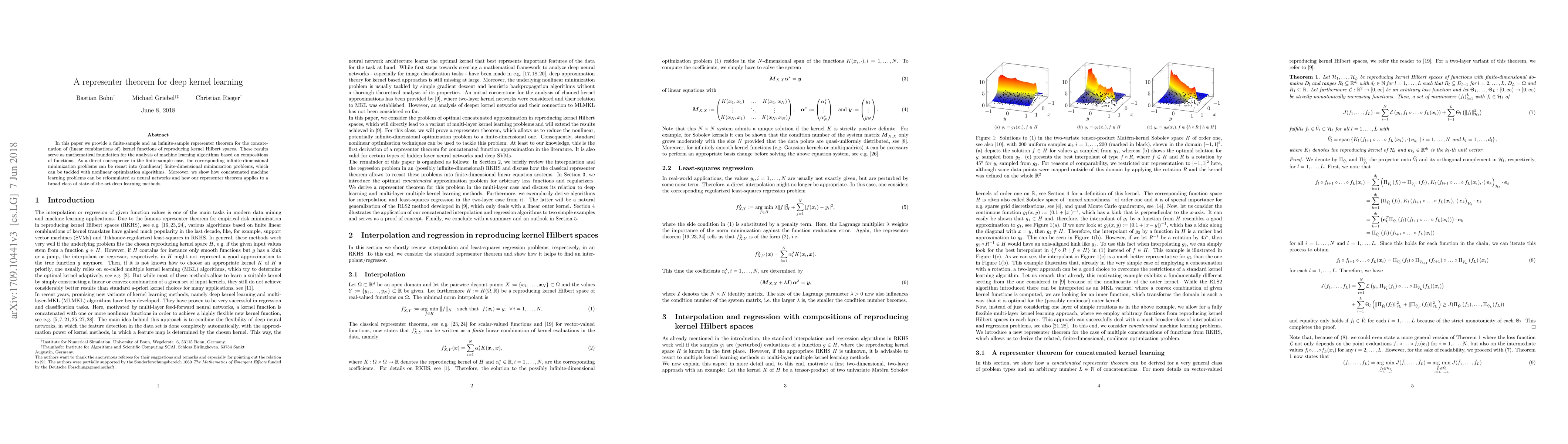 This paper establishes representer theorems for deep kernel learning, providing a mathematical foundation for analyzing machine learning algorithms based on function compositions. It shows that infinite-dimensional problems can be recast into finite-dimensional ones, facilitating the use of nonlinear optimization, and extends the theorem's applicability to various deep learning methods.