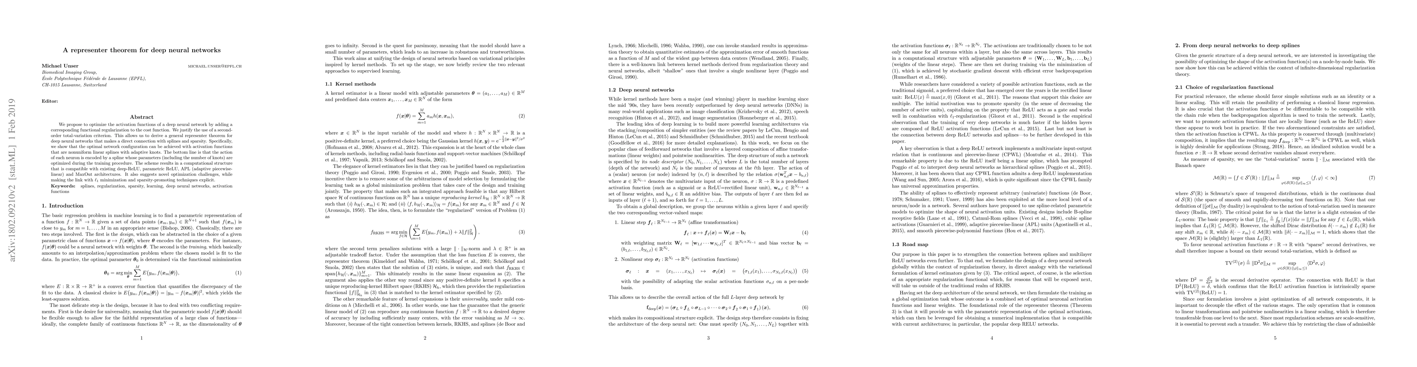 This paper proposes a representer theorem for deep neural networks, optimizing activation functions through functional regularization, specifically a second-order total-variation criterion. It demonstrates that optimal networks use nonuniform linear splines with adaptive knots, linking these structures to splines, sparsity, and existing architectures.