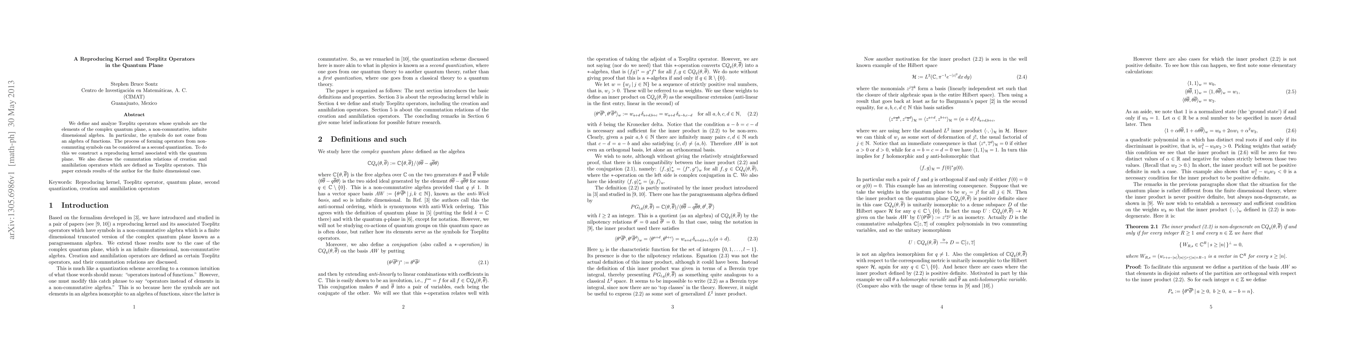 This paper defines and analyzes Toeplitz operators in the complex quantum plane, employing a reproducing kernel to handle non-commuting symbols in a second quantization process. It also explores the commutation relations of creation and annihilation operators defined as Toeplitz operators.