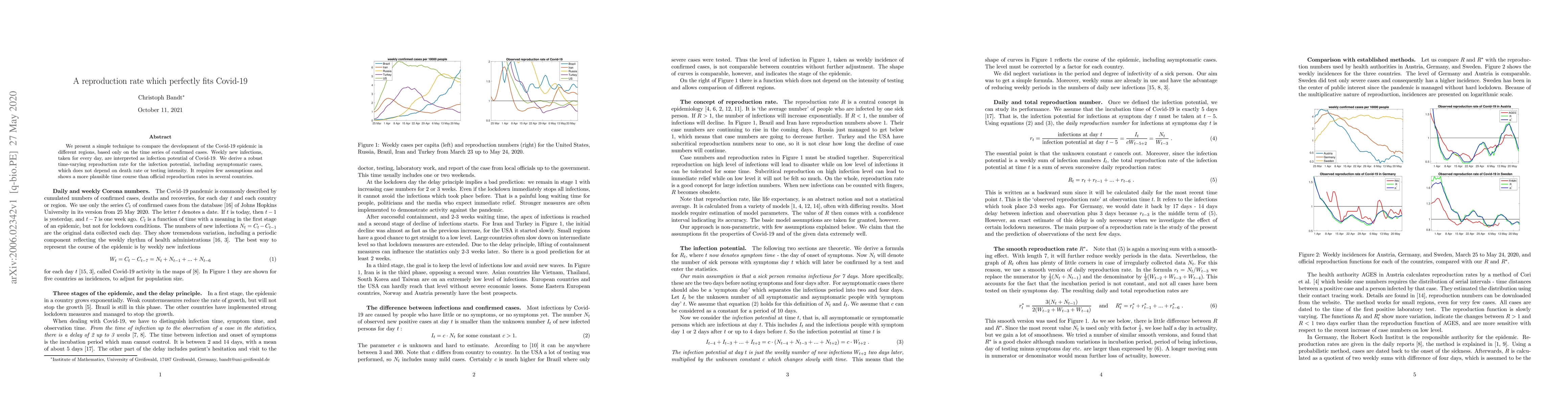 We present a simple technique to compare the development of the Covid-19 epidemic in different regions, based only on the time series of confirmed cases. Weekly new infections, taken for every day, are interpreted as infection potential of Covid-19. We derive a robust time-varying reproduction rate for the infection potential, including asymptomatic cases, which does not depend on death rate or testing intensity. It requires few assumptions and shows a more plausible time course than official reproduction rates in several countries.