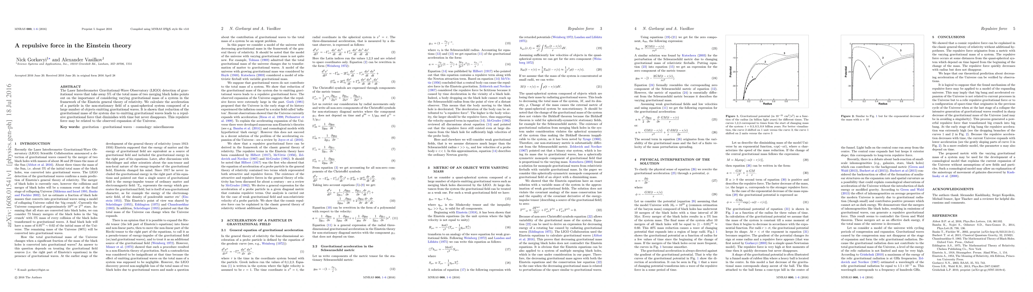 The Laser Interferometer Gravitational-Wave Observatory (LIGO) detection of gravitational waves that take away 5 per cent of the total mass of two merging black holes points out on the importance of considering varying gravitational mass of a system in the framework of the Einstein general theory of relativity. We calculate the acceleration of a particle in the non-stationary field of a quasi-spherical system composed of a large number of objects emitting gravitational waves. It is shown that reduction of the gravitational mass of the system due to emitting gravitational waves leads to a repulsive gravitational force that diminishes with time but never disappears. This repulsive force may be related to the observed expansion of the Universe.
