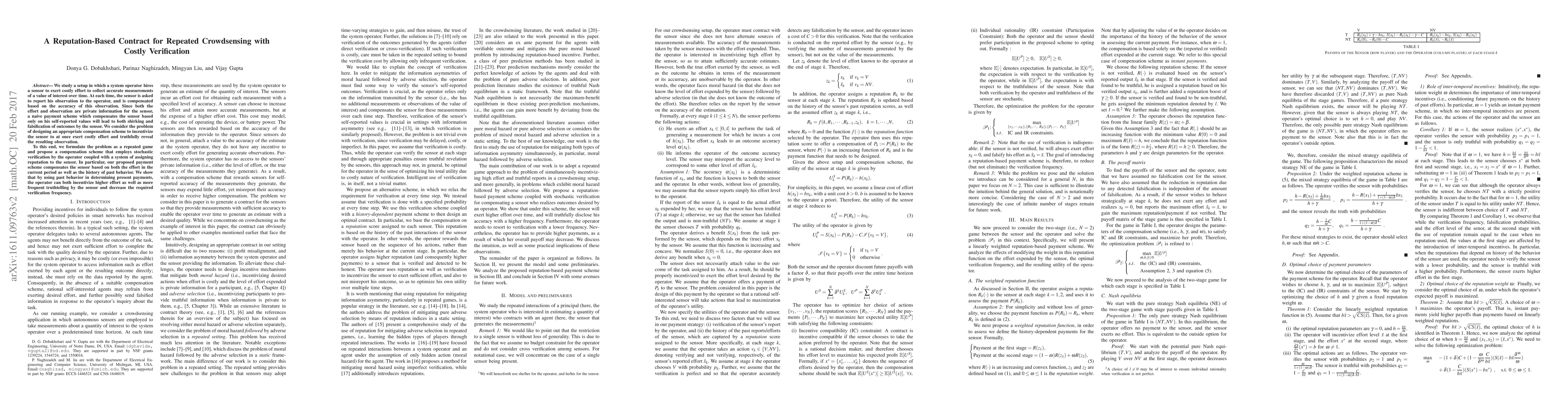 We study a setup in which a system operator hires a sensor to exert costly effort to collect accurate measurements of a value of interest over time. At each time, the sensor is asked to report his observation to the operator, and is compensated based on the accuracy of this observation. Since both the effort and observation are private information for the sensor, a naive payment scheme which compensates the sensor based only on his self-reported values will lead to both shirking and falsification of outcomes by the sensor. We consider the problem of designing an appropriate compensation scheme to incentivize the sensor to at once exert costly effort and truthfully reveal the resulting observation. To this end, we formulate the problem as a repeated game and propose a compensation scheme that employs stochastic verification by the operator coupled with a system of assigning reputation to the sensor. In particular, our proposed payment scheme compensates the sensor based on both the effort in the current period as well as the history of past behavior. We show that by using past behavior in determining present payments, the operator can both incentivize higher effort as well as more frequent truthtelling by the sensor and decrease the required verification frequency.