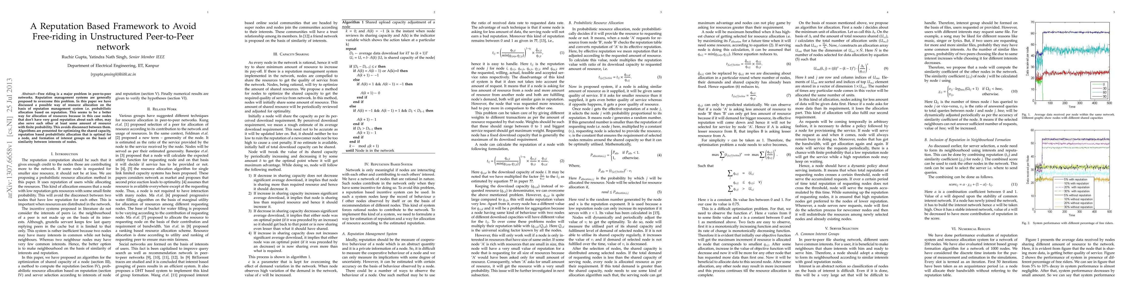 Free riding is a major problem in peer-to-peer networks. Reputation management systems are generally proposed to overcome this problem. In this paper we have discussed a possible way of resource allocation on the basis of reputation management system i.e. probabilistic allocation based on reputation. This seems to be a better way for allocation of resources because in this case nodes that do not have very good reputation about each other, may also serve each other at least some amount of resource with finite probability. This avoids disconnect between them. Algorithms are presented for optimizing the shared capacity, reputation based probabilistic allocation that is optimal for a node, and formation of interest groups on the basis of similarity between interests of nodes.
