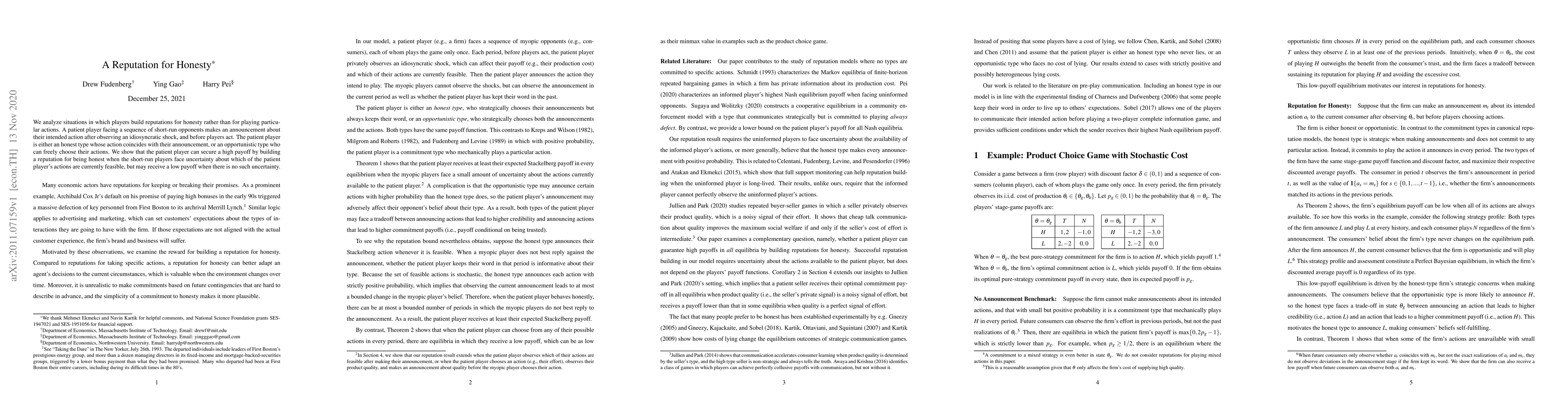 The paper analyzes a game-theoretic model where a patient player builds a reputation for honesty by announcing intended actions after observing an idiosyncratic shock, before acting, against short-run opponents.