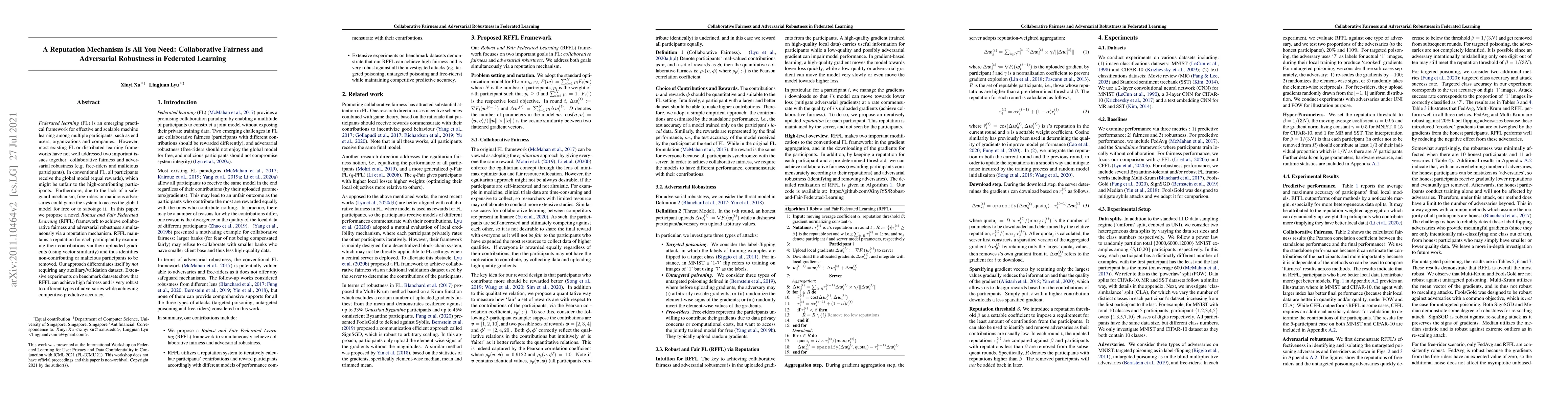 This paper proposes a Robust and Fair Federated Learning (RFFL) framework that addresses collaborative fairness and adversarial robustness in federated learning using a reputation mechanism. RFFL evaluates participant contributions via gradient similarity to identify and exclude free-riders or malicious actors, achieving high fairness and robustness without requiring auxiliary datasets.