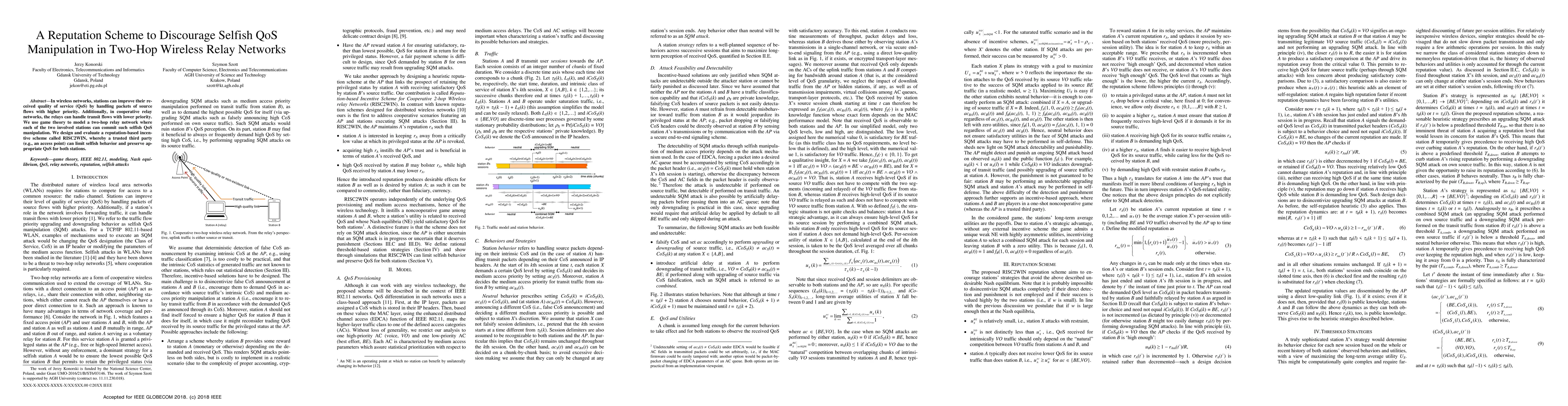 This paper proposes a reputation-based scheme, RISC2WIN, to mitigate selfish QoS manipulation in two-hop relay networks using game theory. A trusted third party enforces this scheme to ensure fair QoS for all stations.