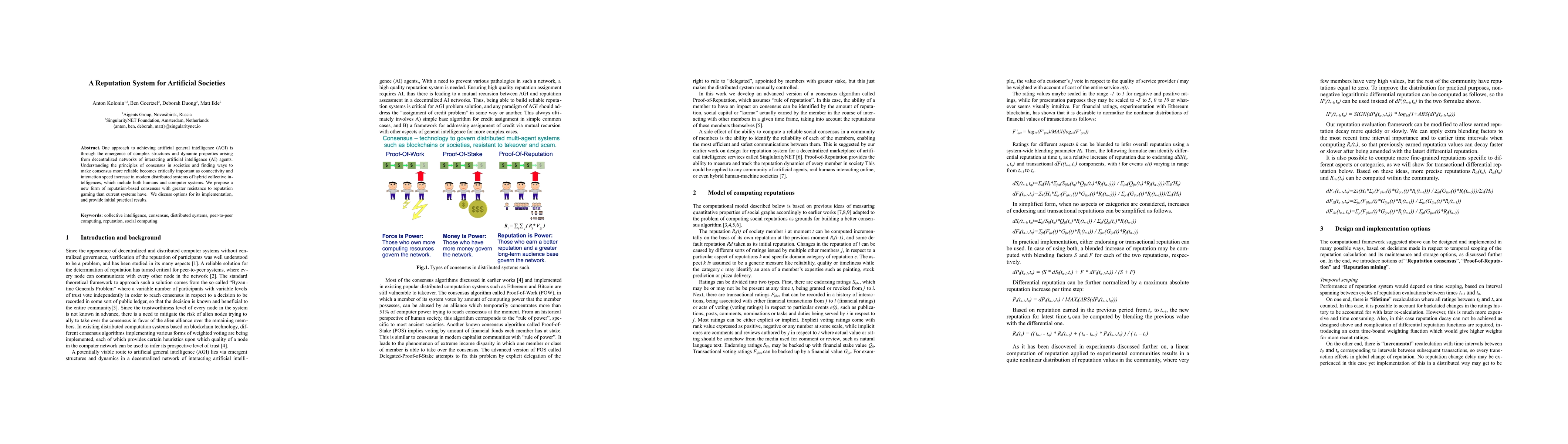 One approach to achieving artificial general intelligence (AGI) is through the emergence of complex structures and dynamic properties arising from decentralized networks of interacting artificial intelligence (AI) agents. Understanding the principles of consensus in societies and finding ways to make consensus more reliable becomes critically important as connectivity and interaction speed increase in modern distributed systems of hybrid collective intelligences, which include both humans and computer systems. We propose a new form of reputation-based consensus with greater resistance to reputation gaming than current systems have. We discuss options for its implementation, and provide initial practical results.