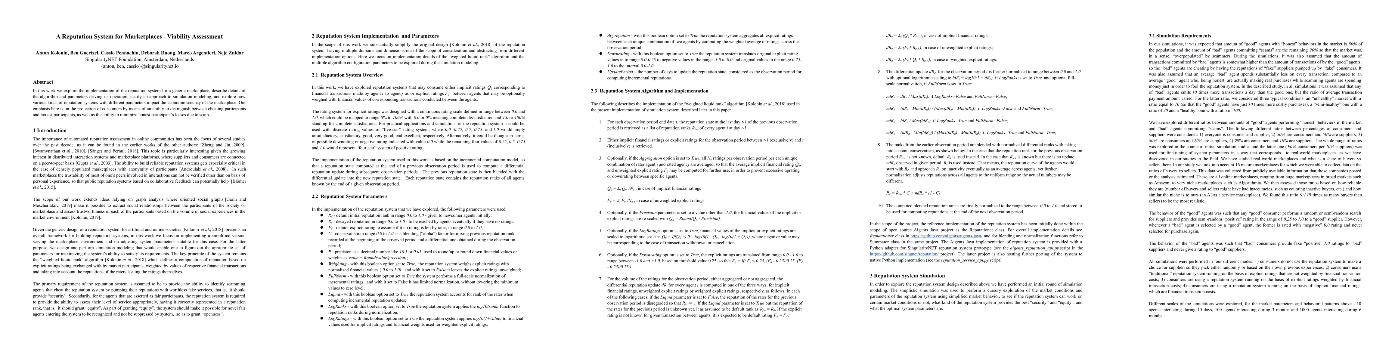 This research paper assesses a reputation system for marketplaces to protect consumers from cheaters and minimize losses for honest participants. It explores how different parameters impact the economic security of the marketplace.