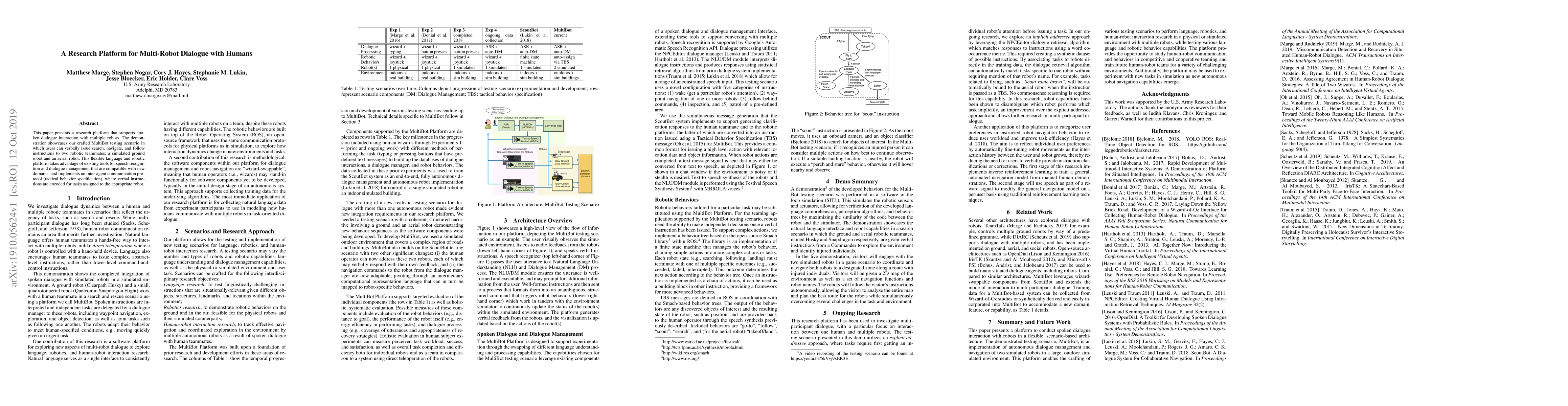 This paper presents a research platform that supports spoken dialogue interaction with multiple robots. The demonstration showcases our crafted MultiBot testing scenario in which users can verbally issue search, navigate, and follow instructions to two robotic teammates: a simulated ground robot and an aerial robot. This flexible language and robotic platform takes advantage of existing tools for speech recognition and dialogue management that are compatible with new domains, and implements an inter-agent communication protocol (tactical behavior specification), where verbal instructions are encoded for tasks assigned to the appropriate robot.