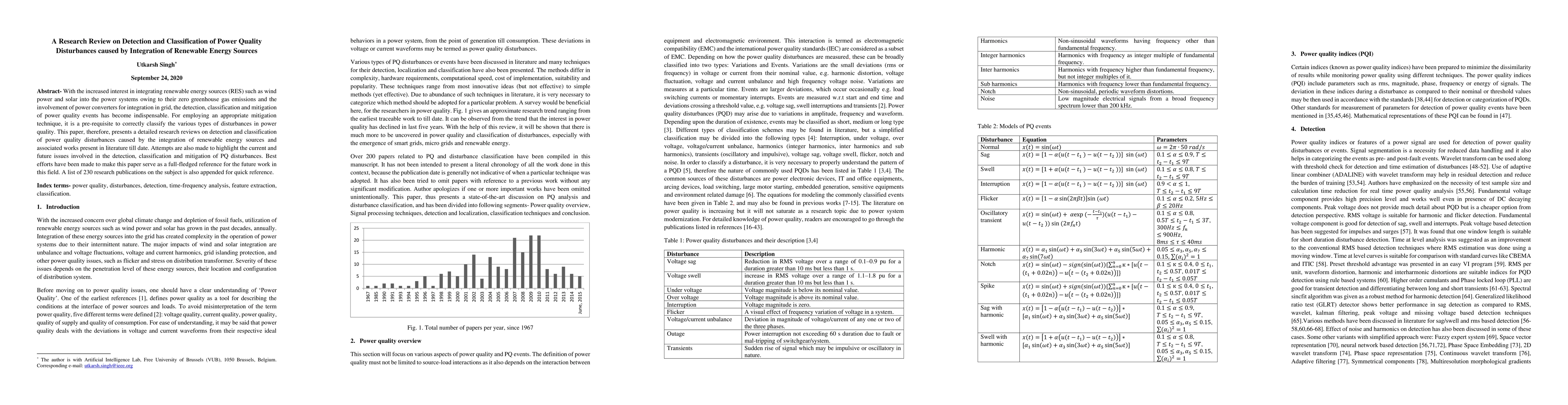 This paper reviews detection and classification methods for power quality disturbances arising from the integration of renewable energy sources like wind and solar. The review aims to identify current issues and future challenges in mitigating these disturbances, offering a comprehensive reference with a list of 230 related publications.