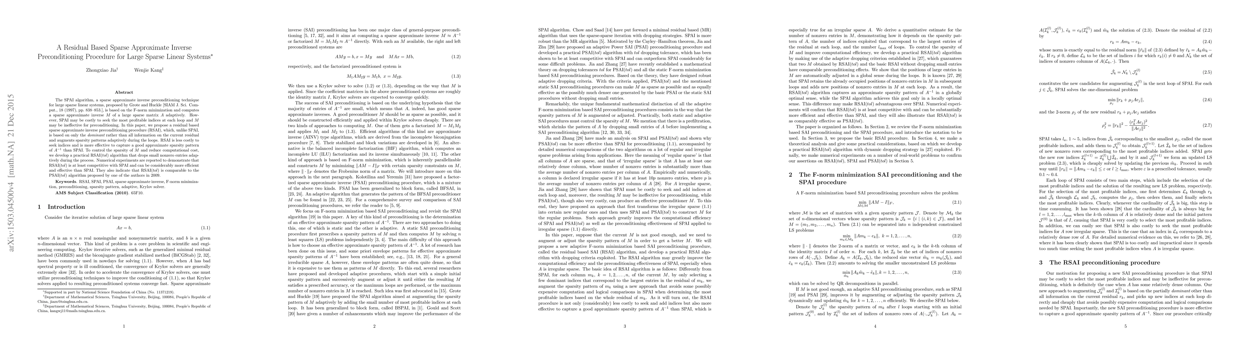 This paper proposes a residual based sparse approximate inverse preconditioning procedure (RSAI) to improve the efficiency of solving large sparse linear systems. Unlike the SPAI algorithm, RSAI focuses on dominant residual information and adaptively enhances sparsity patterns, resulting in lower computational costs and better preconditioning effectiveness.