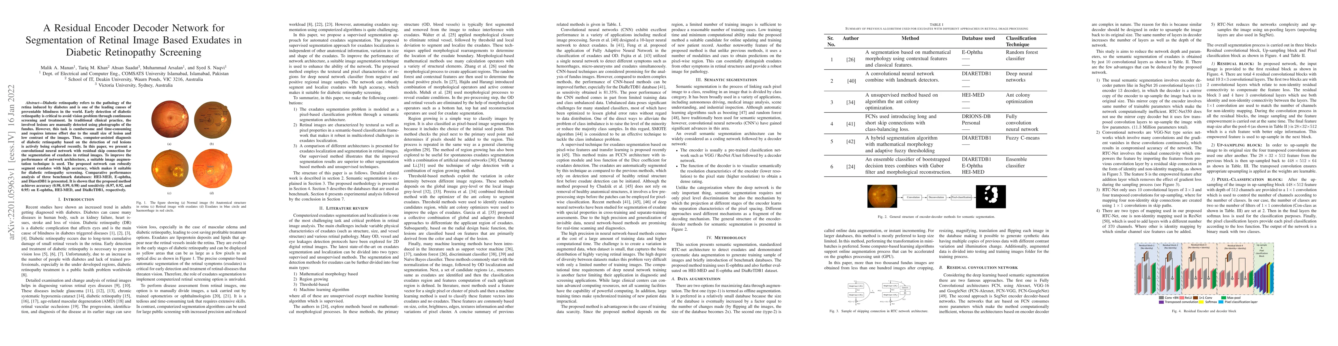 This paper presents a residual encoder-decoder network for segmenting exudates in retinal images to aid in diabetic retinopathy screening. The proposed method achieves high accuracy and sensitivity on three benchmark databases, demonstrating its potential for clinical use.
