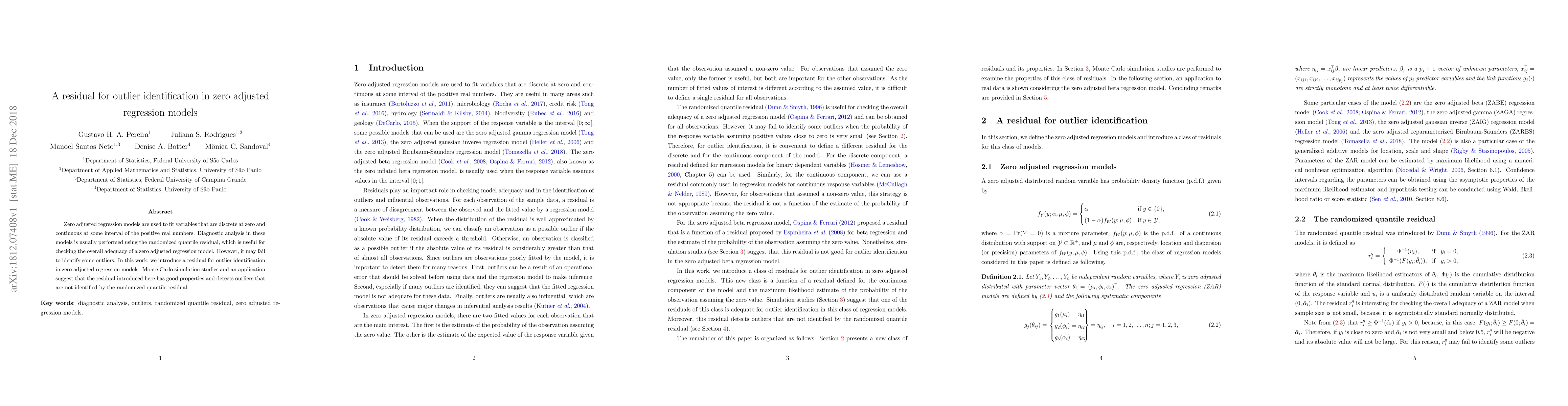 This paper introduces a new residual method for identifying outliers in zero adjusted regression models, which outperforms the existing randomized quantile residual in detecting outliers, as demonstrated through Monte Carlo simulations and practical applications.
