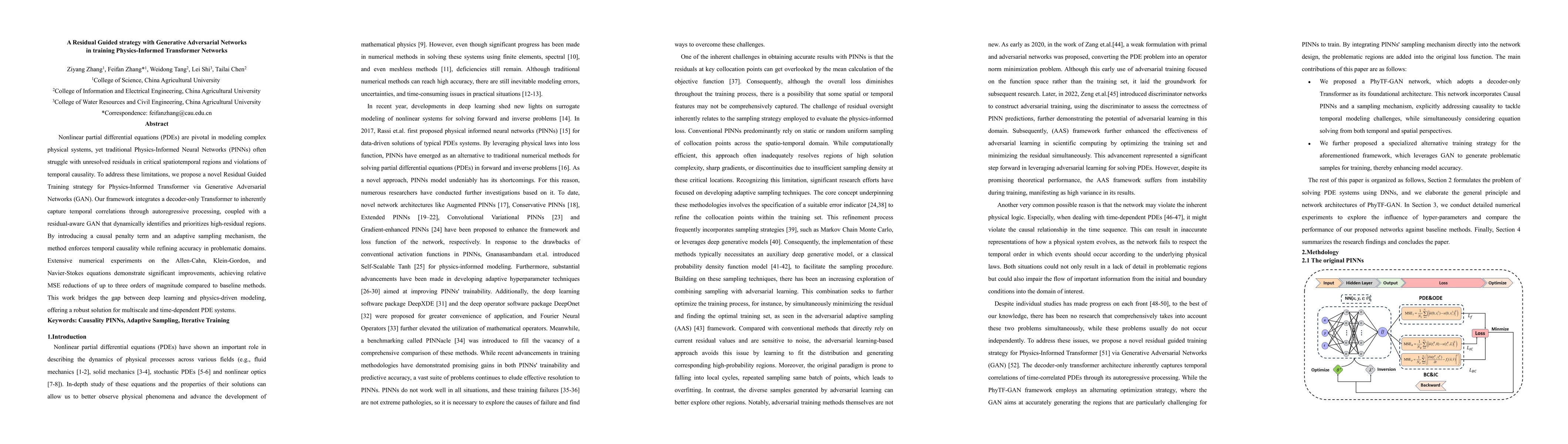 Nonlinear partial differential equations (PDEs) are pivotal in modeling complex physical systems, yet traditional Physics-Informed Neural Networks (PINNs) often struggle with unresolved residuals in critical spatiotemporal regions and violations of temporal causality. To address these limitations, we propose a novel Residual Guided Training strategy for Physics-Informed Transformer via Generative Adversarial Networks (GAN). Our framework integrates a decoder-only Transformer to inherently capture temporal correlations through autoregressive processing, coupled with a residual-aware GAN that dynamically identifies and prioritizes high-residual regions. By introducing a causal penalty term and an adaptive sampling mechanism, the method enforces temporal causality while refining accuracy in problematic domains. Extensive numerical experiments on the Allen-Cahn, Klein-Gordon, and Navier-Stokes equations demonstrate significant improvements, achieving relative MSE reductions of up to three orders of magnitude compared to baseline methods. This work bridges the gap between deep learning and physics-driven modeling, offering a robust solution for multiscale and time-dependent PDE systems.