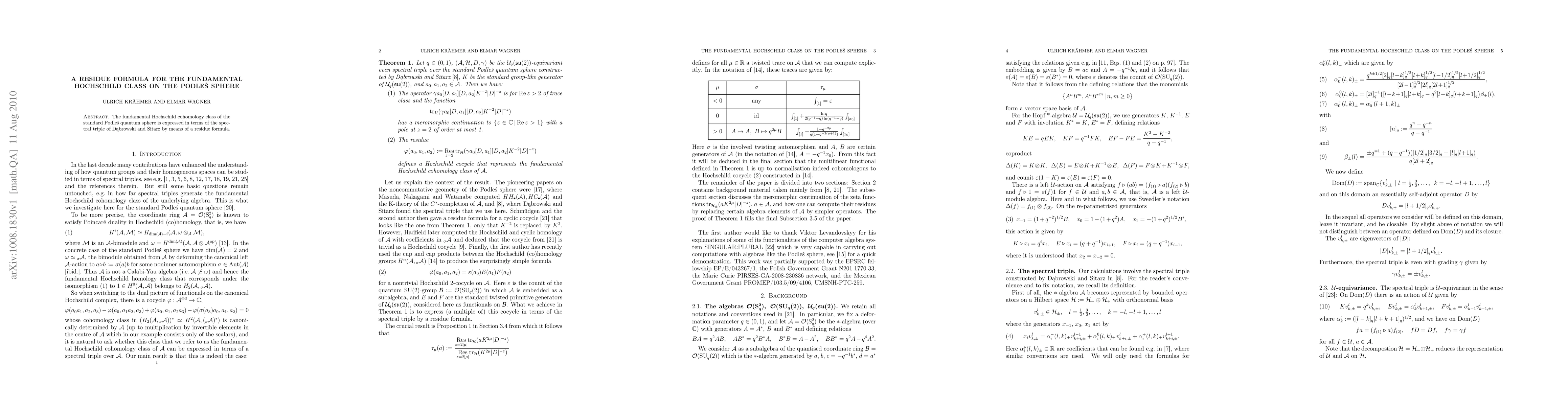 Summary: This paper derives a residue formula to express the fundamental Hochschild cohomology class of the Podles quantum sphere, utilizing the spectral triple of Dabrowski and Sitarz. The result provides a novel connection between noncommutative geometry and Hochschild cohomology.