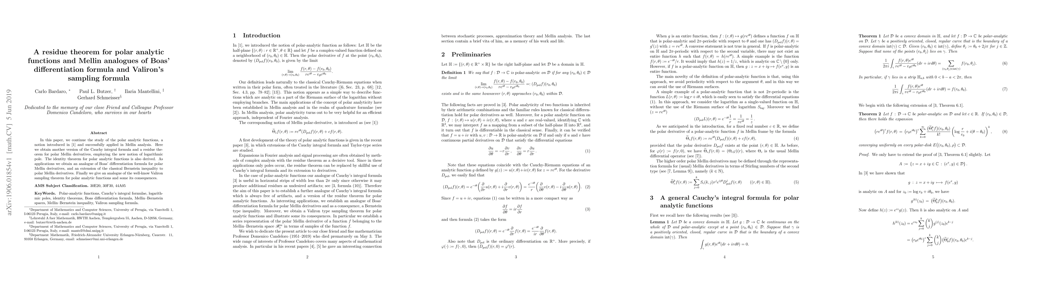This paper develops a residue theorem for polar analytic functions and introduces Mellin analogues of Boas' differentiation formula and Valiron's sampling formula. It presents a new version of the Cauchy integral formula and a residue theorem for polar Mellin derivatives, along with an identity theorem, and extends classical inequalities to these new functions.