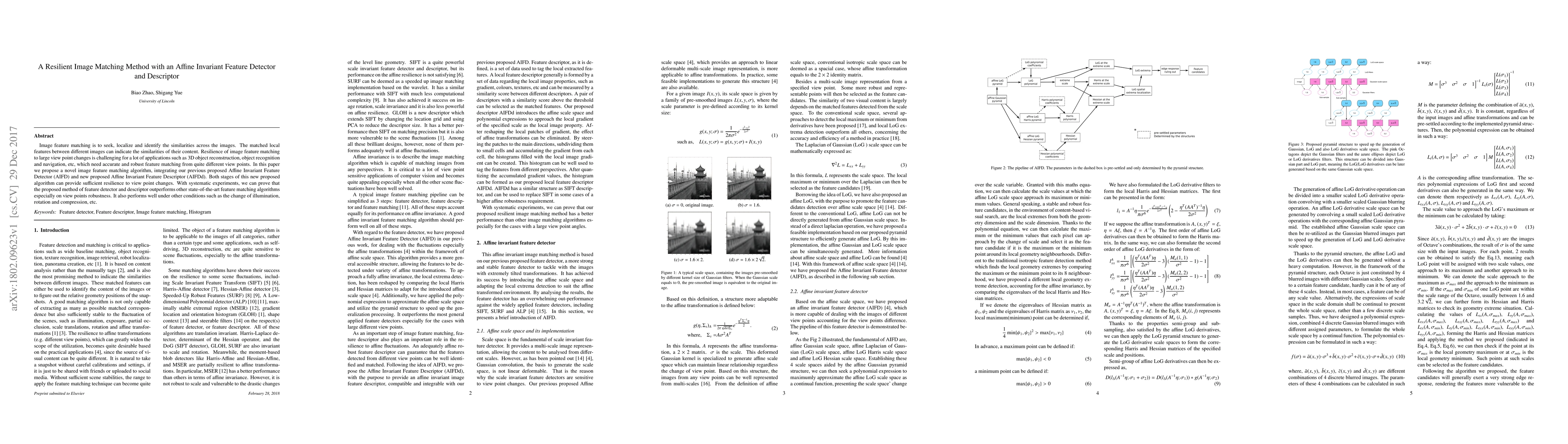 This paper presents a novel image feature matching method using an Affine Invariant Feature Detector and Descriptor, which enhances resilience to large view point changes, illumination, rotation, and compression. Experimental results demonstrate superior performance over existing algorithms in terms of robustness and accuracy.