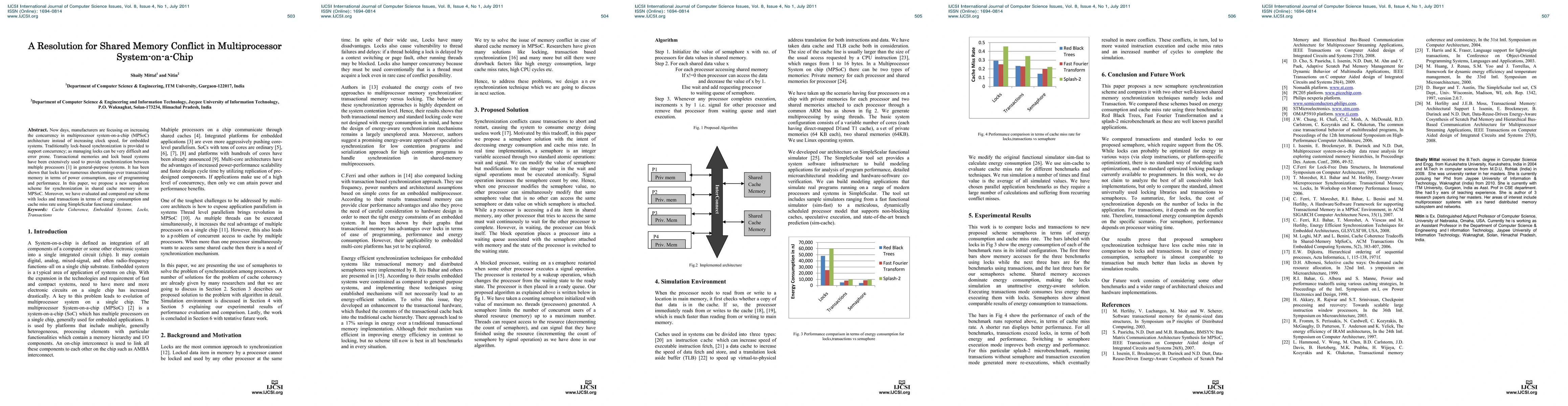 This paper proposes a novel semaphore-based synchronization scheme to address shared memory conflicts in multiprocessor System-on-a-Chip (MPSoC) architectures, aiming to improve power efficiency and performance over traditional lock-based methods. The proposed scheme is evaluated against locks and transactional memory using the SimpleScalar simulator, showing better energy consumption and cache miss rates.