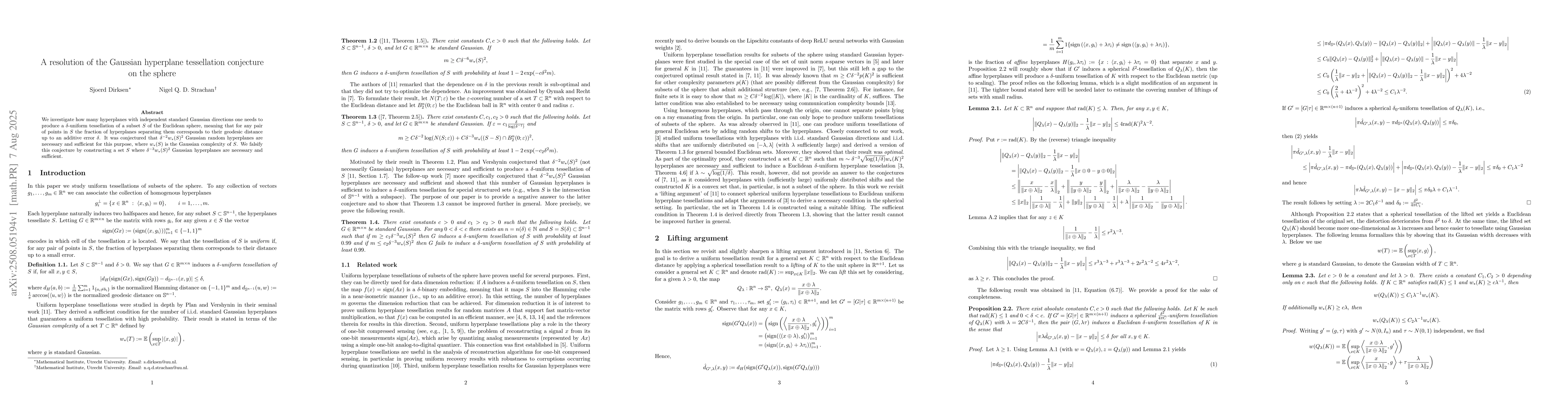 We investigate how many hyperplanes with independent standard Gaussian directions one needs to produce a $\delta$-uniform tessellation of a subset $S$ of the Euclidean sphere, meaning that for any pair of points in $S$ the fraction of hyperplanes separating them corresponds to their geodesic distance up to an additive error $\delta$. It was conjectured that $\delta^{-2}w_*(S)^2$ Gaussian random hyperplanes are necessary and sufficient for this purpose, where $w_*(S)$ is the Gaussian complexity of $S$. We falsify this conjecture by constructing a set $S$ where $\delta^{-3}w_*(S)^2$ Gaussian hyperplanes are necessary and sufficient.