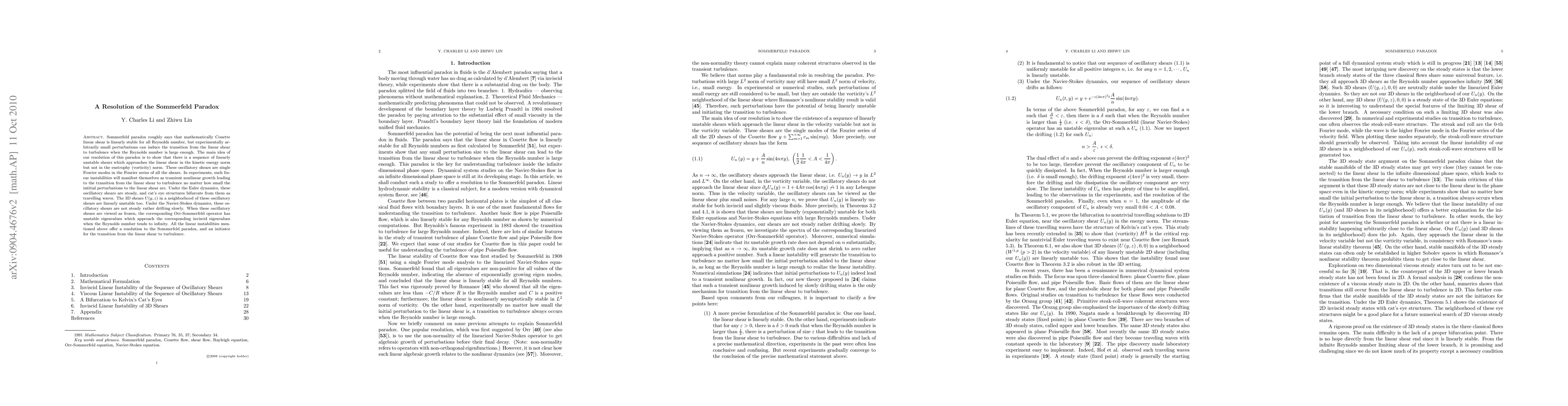 Sommerfeld paradox roughly says that mathematically Couette linear shear is linearly stable for all Reynolds number, but experimentally arbitrarily small perturbations can induce the transition from the linear shear to turbulence when the Reynolds number is large enough. The main idea of our resolution of this paradox is to show that there is a sequence of linearly unstable shears which approaches the linear shear in the kinetic energy norm but not in the enstrophy (vorticity) norm. These oscillatory shears are single Fourier modes in the Fourier series of all the shears. In experiments, such linear instabilities will manifest themselves as transient nonlinear growth leading to the transition from the linear shear to turbulence no matter how small the intitial perturbations to the linear shear are. Under the Euler dynamics, these oscillatory shears are steady, and cat's eye structures bifurcate from them as travelling waves. The 3D shears $U(y,z)$ in a neighborhood of these oscillatory shears are linearly unstable too. Under the Navier-Stokes dynamics, these oscillatory shears are not steady rather drifting slowly. When these oscillatory shears are viewed as frozen, the corresponding Orr-Sommerfeld operator has unstable eigenvalues which approach the corresponding inviscid eigenvalues when the Reynolds number tends to infinity. All the linear instabilities mentioned above offer a resolution to the Sommerfeld paradox, and an initiator for the transition from the linear shear to turbulence.