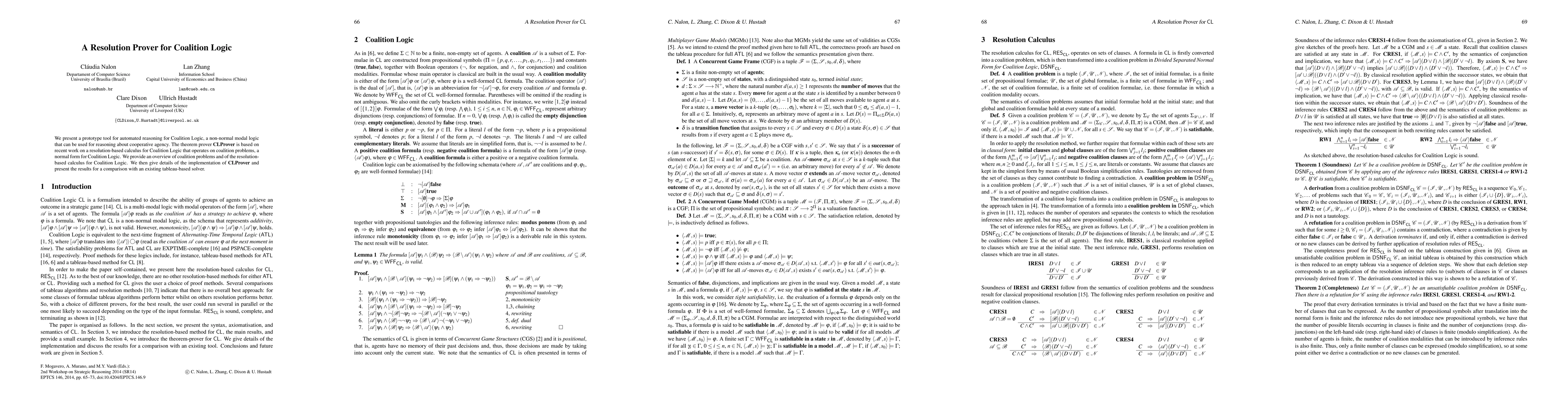 This paper introduces CLProver, a resolution-based theorem prover for Coalition Logic, a non-normal modal logic for reasoning about cooperative agency. The tool compares favorably to an existing tableau-based solver, demonstrating the effectiveness of the resolution-based calculus.