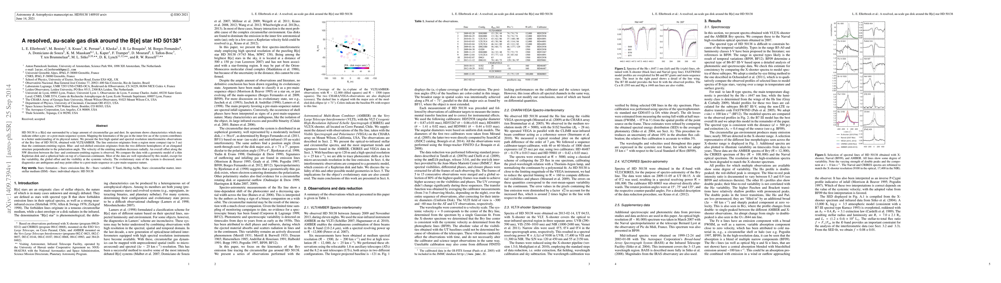 HD 50138 is a B[e] star surrounded by a large amount of circumstellar gas and dust. Its spectrum shows characteristics which may indicate either a pre- or a post-main-sequence system. Mapping the kinematics of the gas in the inner few au of the system contributes to a better understanding of its physical nature. We present the first high spatial and spectral resolution interferometric observations of the Br-gamma line of HD~50138, obtained with VLTI/AMBER. The line emission originates from a region more compact (up to 3 au) than the continuum-emitting region. Blue- and red-shifted emission originates from the two different hemispheres of an elongated structure perpendicular to the polarization angle. The velocity of the emitting medium decreases radially. An overall offset along the NW direction between the line- and continuum-emitting regions is observed. We compare the data with a geometric model of a thin Keplerian disk and a spherical halo on top of a Gaussian continuum. Most of the data are well reproduced by this model, except for the variability, the global offset and the visibility at the systemic velocity. The evolutionary state of the system is discussed; most diagnostics are ambiguous and may point either to a post-main-sequence or a pre-main-sequence nature.