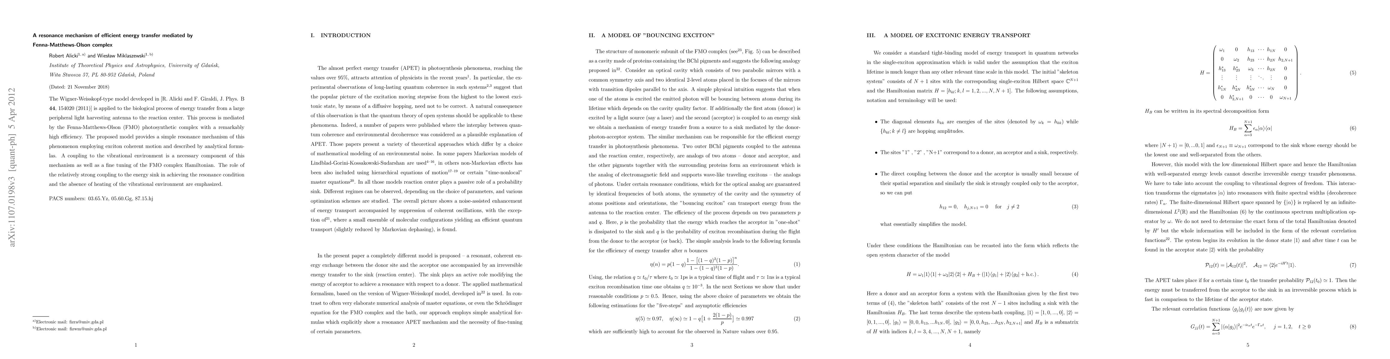 This paper applies a Wigner-Weisskopf-type model to explain the high efficiency of energy transfer in the Fenna-Matthews-Olson complex, proposing a resonance mechanism involving exciton coherent motion and strong coupling to the vibrational environment. The model emphasizes the importance of fine-tuning the FMO complex Hamiltonian and the role of energy sink coupling in achieving resonance without heating the vibrational environment.